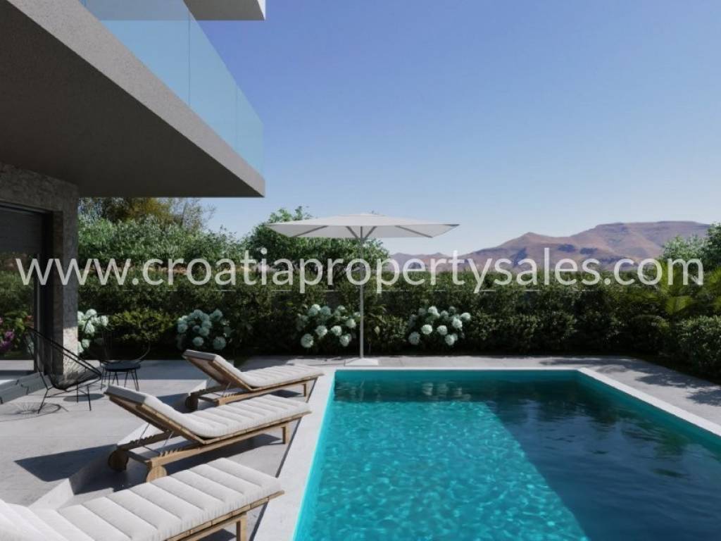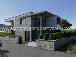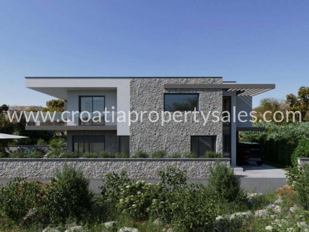 New villa in Murter in excellent location 1st row to the sea being built by a well-known developer. The villa spreads over 2 floors and has a net usable area of 215m2 The ground floor consists of a bedroom, bathroom and large open space living, kitchen and dining area opening onto the terrace leading to the swimming pool with sunbathing area. The second floor has 3 en-suite bedrooms each with a built-in wardrobe area. Bedrooms 1 and 2 share a large covered terrace overlooking the swimming pool with views of the sea, bedroom 3 has a covered balcony area. The villa has 2 parking spaces. The expected completion date is at the end of 2025. Floor plans by request.