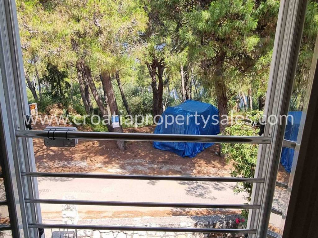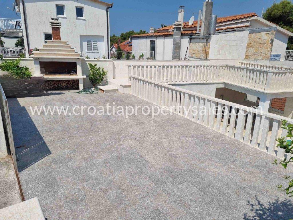 The entrance to the property is from the main road. First part of the property is an outdoor parking space for 3 cars, but also includes a BBQ area and an upper terrace with a sea view. There are a few fruit trees planted around the upper area