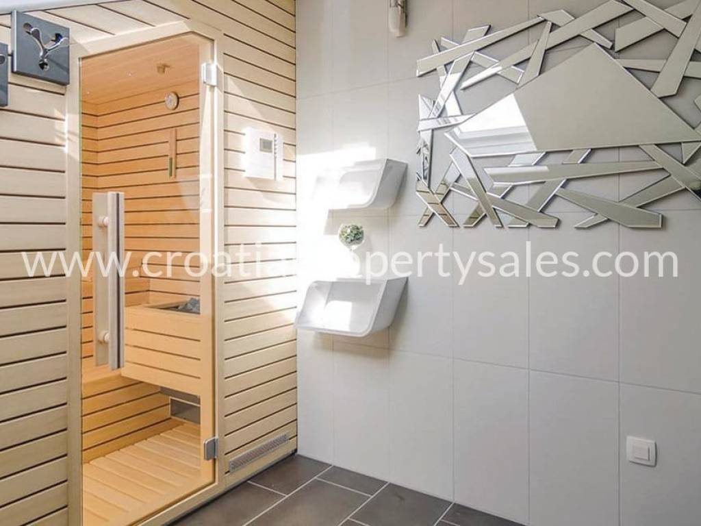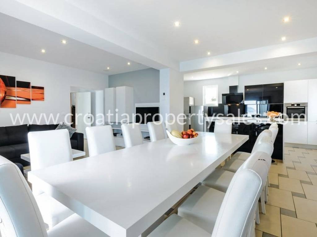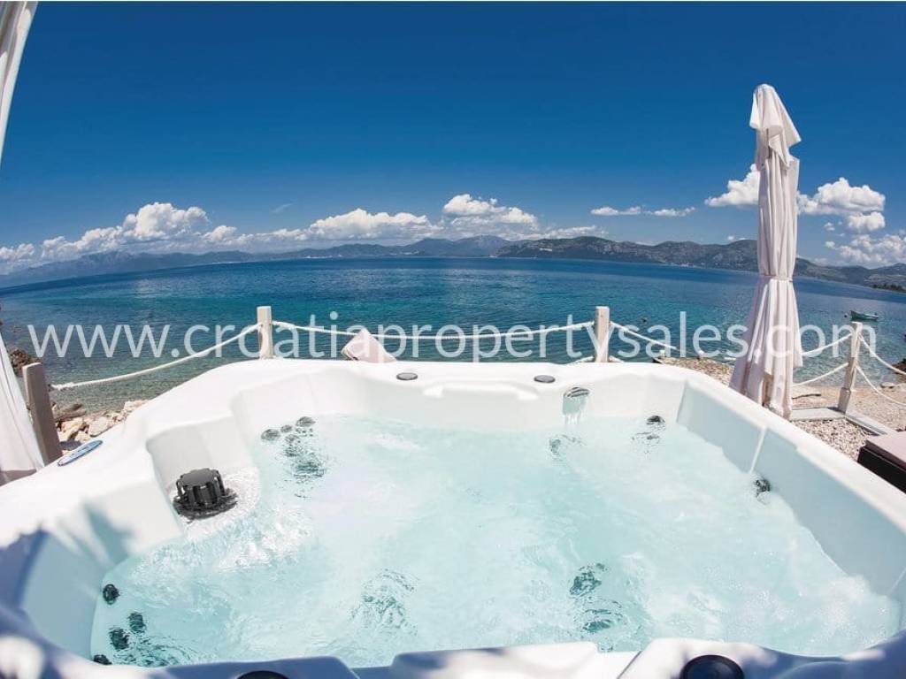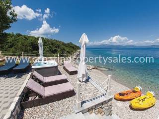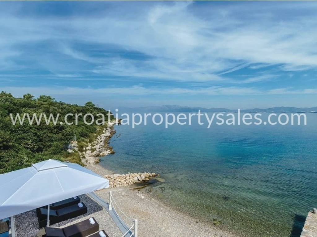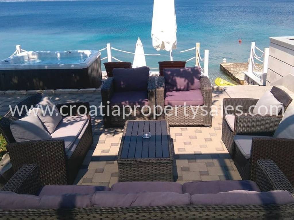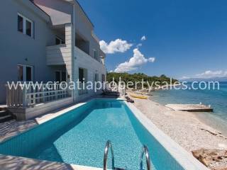 Unique villa in the first row to the sea, with private beach and boat mooring. The villa is located on a plot of 662 m2 and has 318 m2 of living space. The ground floor consists of a large spacious living room and kitchen, large bathroom, en suite room and a small fitness room. An internal staircase leads to the first floor where there are three spacious bedrooms - each with a small living room and bathroom. In the attic of the house there is a bathroom, two rooms that are connected by a door but also have an external entrance. The villa is located at the very end of the village, which gives it privacy and, practically, a private pebble beach. In front of the house there is a small dock for a smaller boat. Behind the house there is a small football field with artificial grass.