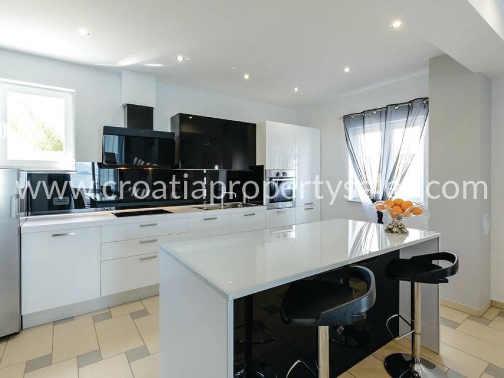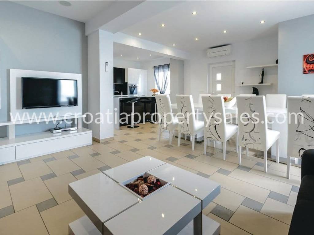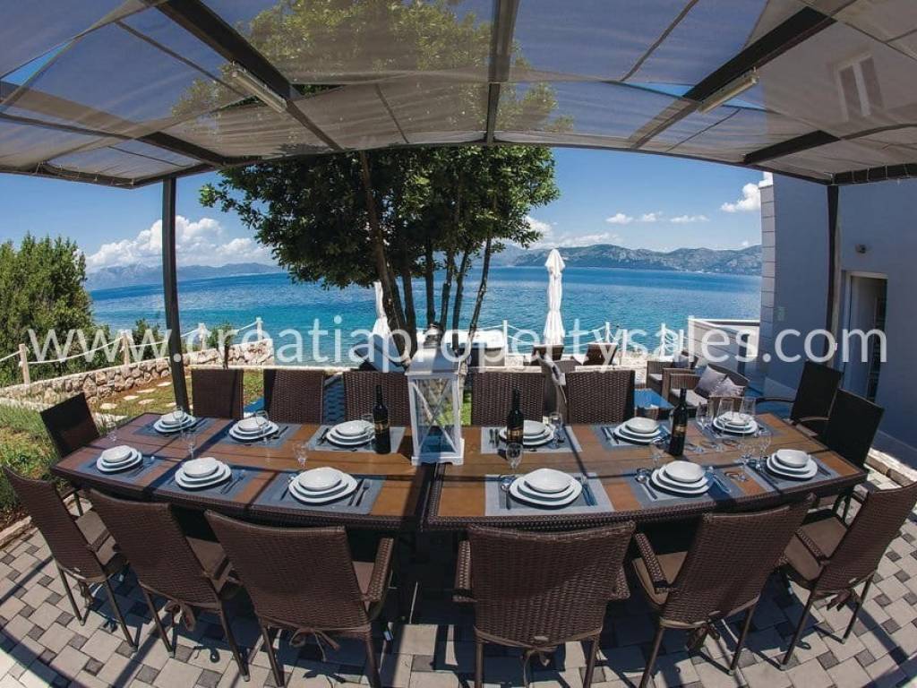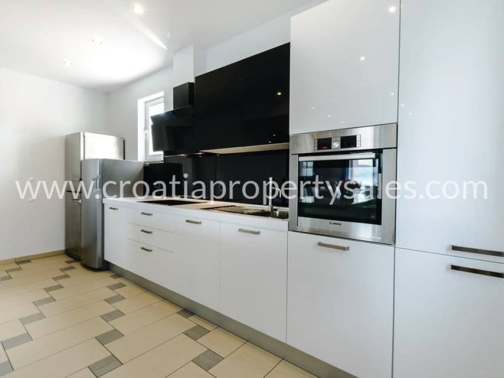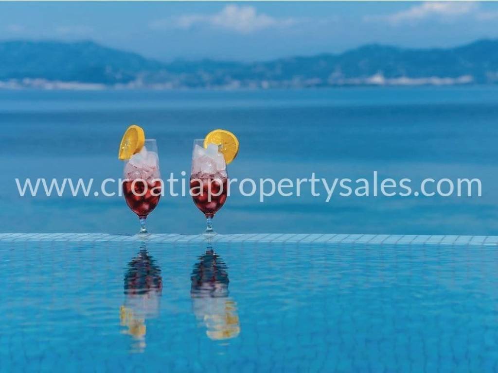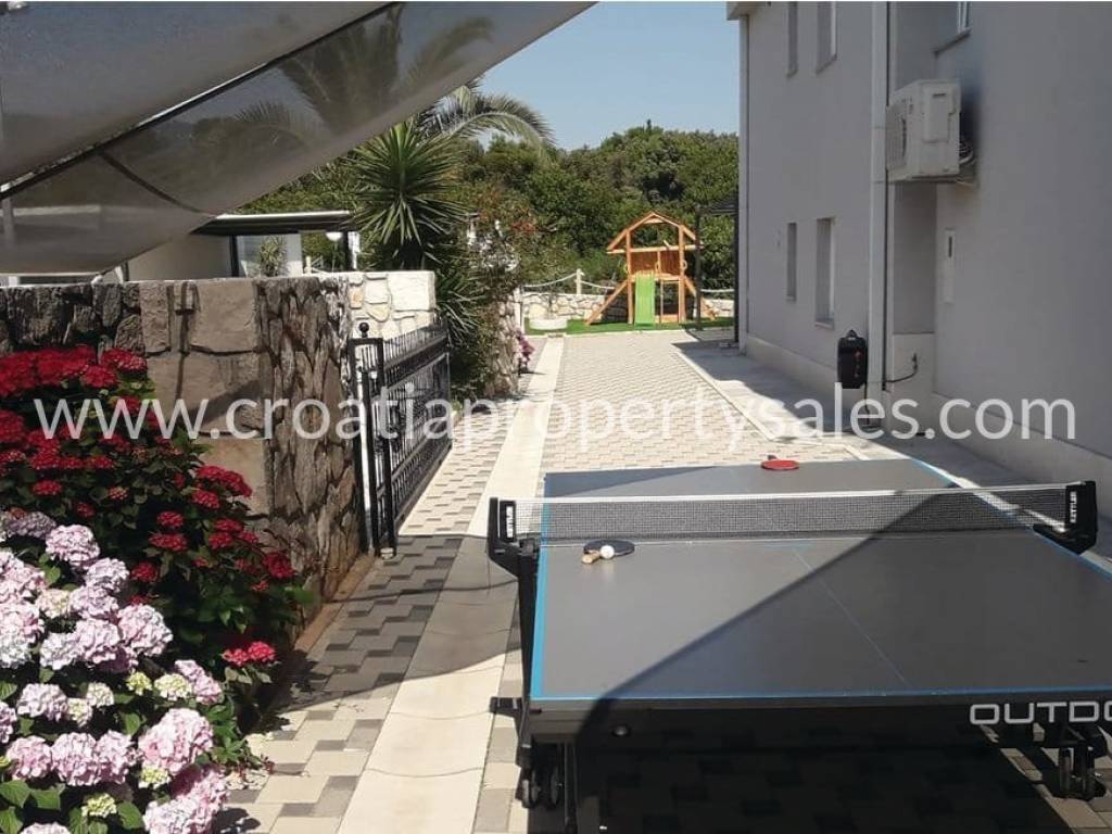 Unique villa in the first row to the sea, with private beach and boat mooring. The villa is located on a plot of 662 m2 and has 318 m2 of living space. The ground floor consists of a large spacious living room and kitchen, large bathroom, en suite room and a small fitness room. An internal staircase leads to the first floor where there are three spacious bedrooms - each with a small living room and bathroom. In the attic of the house there is a bathroom, two rooms that are connected by a door but also have an external entrance. The villa is located at the very end of the village, which gives it privacy and, practically, a private pebble beach. In front of the house there is a small dock for a smaller boat. Behind the house there is a small football field with artificial grass.