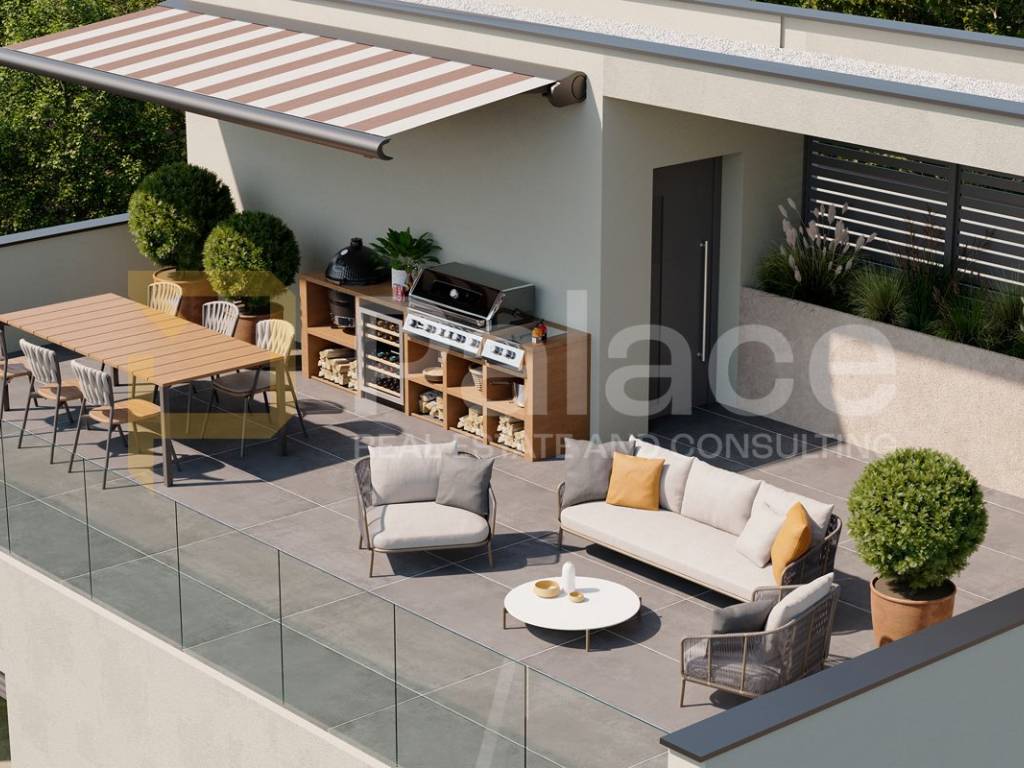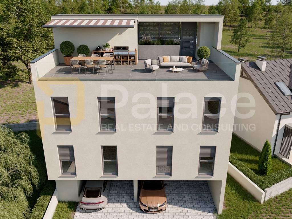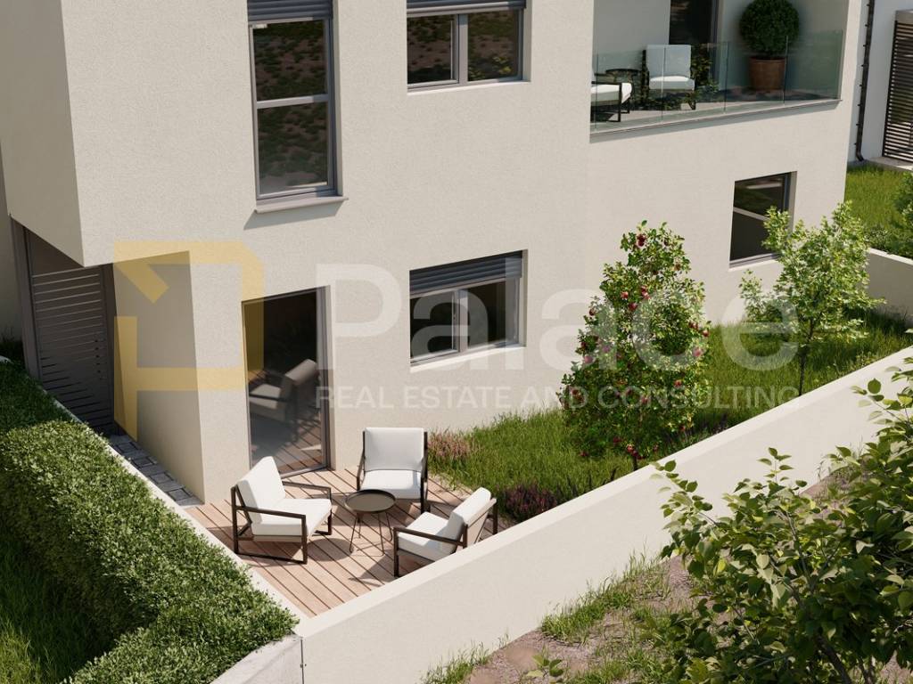 The apartment is equipped with a solar power plant, heat pump, split system air conditioning, oak flooring, as well as ceramics, sanitary ware, and interior doors from renowned manufacturers. The entrance doors are burglar-proof with a video intercom. According to the project, the total expected energy costs per year are 200 EUR. The building has an energy class B. Access to the yard is also possible through a garden entrance.