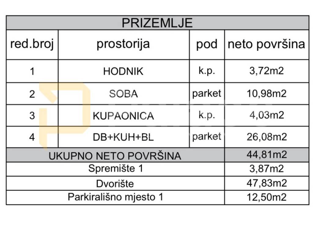 The apartment consists of a hallway, bedroom, bathroom, living room, and kitchen with a dining area. The price of the apartment includes a covered parking space, a fenced yard with a total size of 47.83 m2, and an additional storage room of 3.87 m2.
