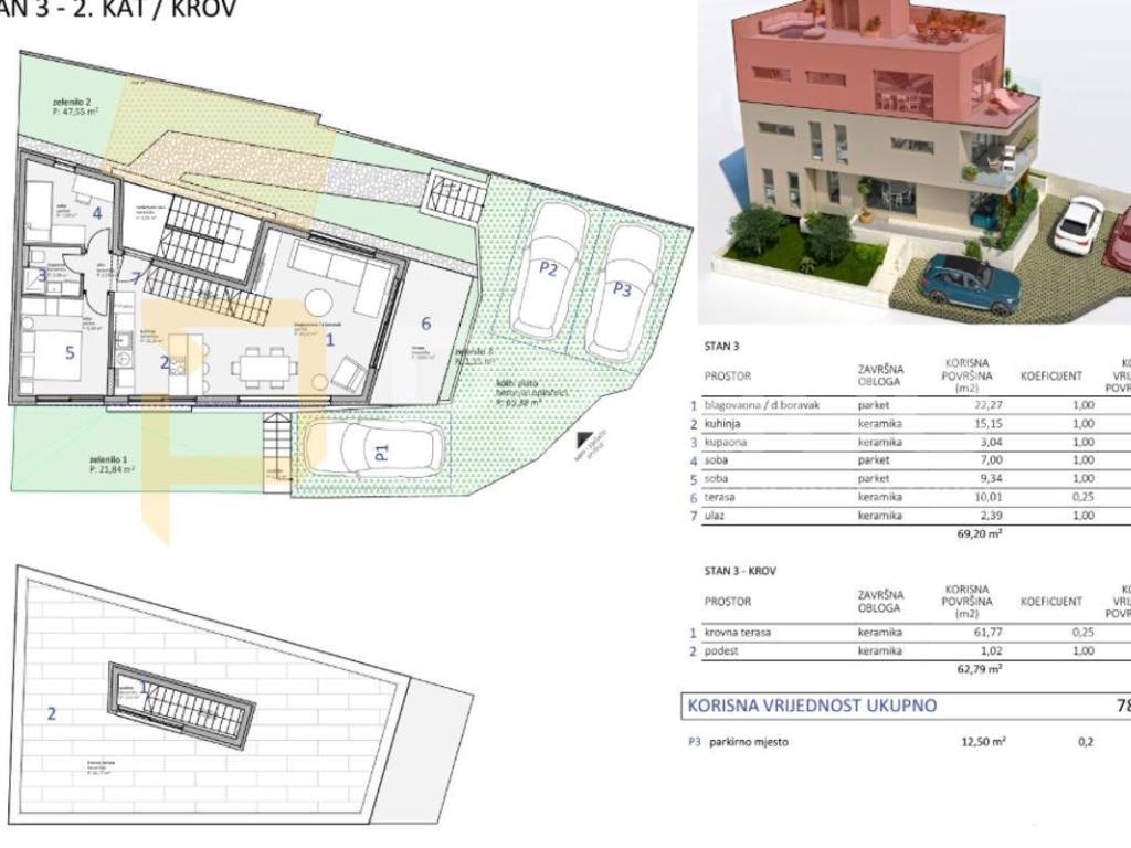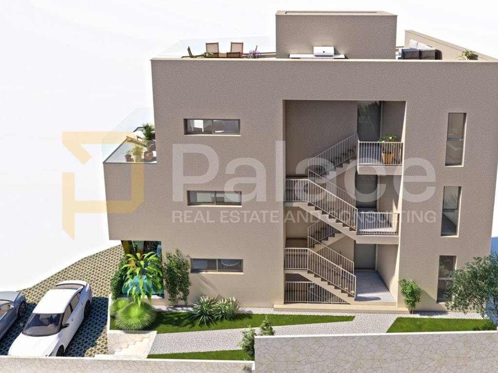 The apartment, sized at 78.15 m2, is situated on the second floor of the building. It comprises two bedrooms, a bathroom, and a beautiful open space concept kitchen with dining and living area. The kitchen leads to an external covered terrace facing southeast, as well as a rooftop terrace providing a magnificent panoramic view of the sea and the Šibenik channel, and the apartment also includes an outside parking space. A comfortable and airy apartment, filled with natural light, featuring modern design and contemporary aesthetics, represents a unique buying opportunity.