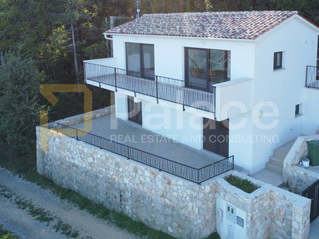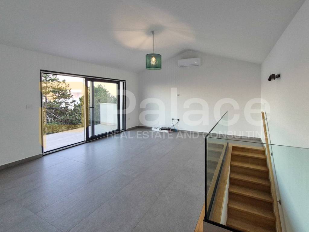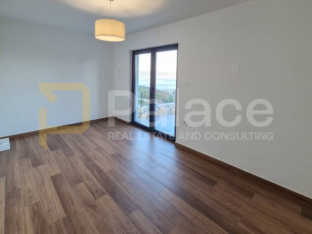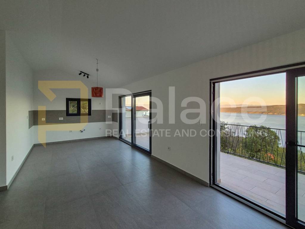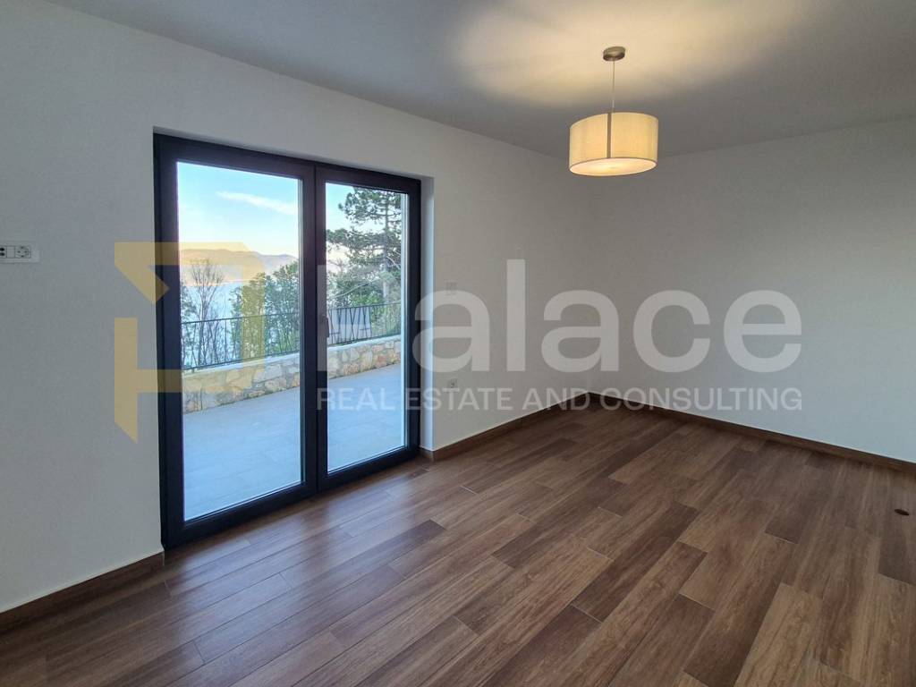 On the first floor, you will be welcomed by a spacious living room and kitchen, where the large open concept allows you to enjoy the view of the entire Kvarner Bay and the island of Cres through two double doors leading to a large terrace.