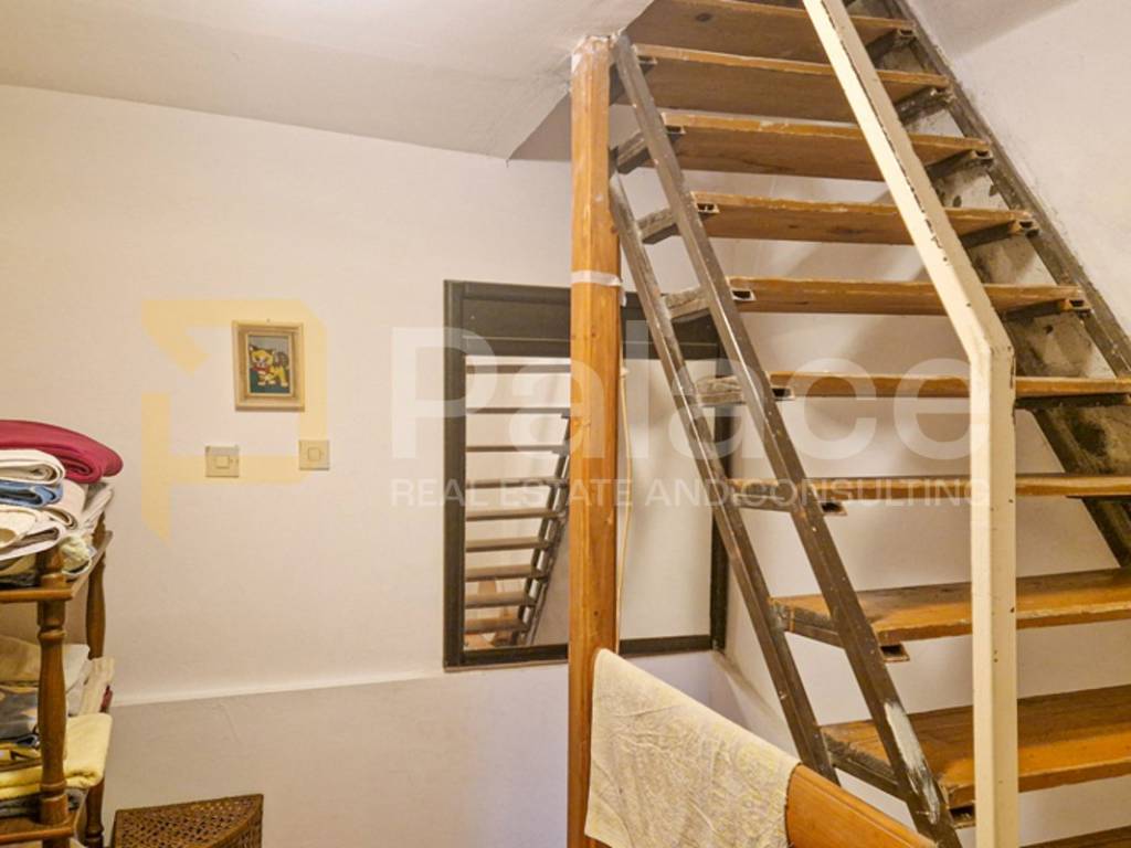 On the ground floor, there is a kitchen with a living room, concrete stairs lead to the first floor where a comfortable bedroom and bathroom are located, and wooden stairs lead to the second floor where two more bedrooms are situated.