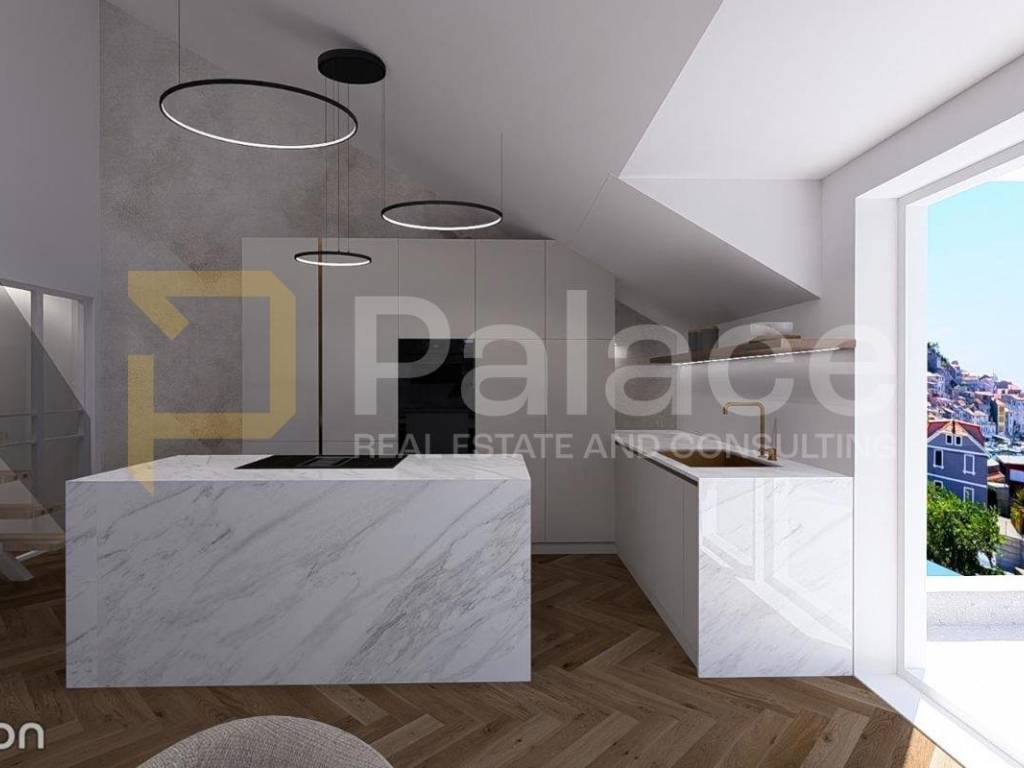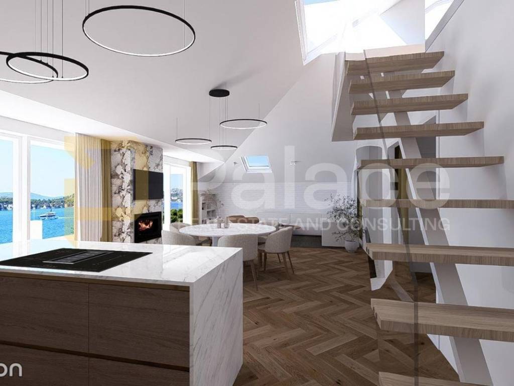 The apartment is spread over two floors, with a total area of 138.97 m2. On the first floor, there is an open concept kitchen, dining room, and living room with a beautiful view of the Šibenik channel, St. James Cathedral, and the city.