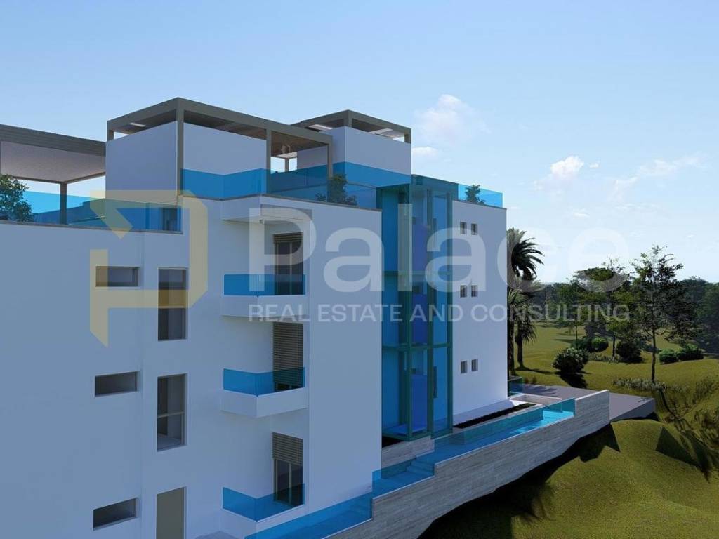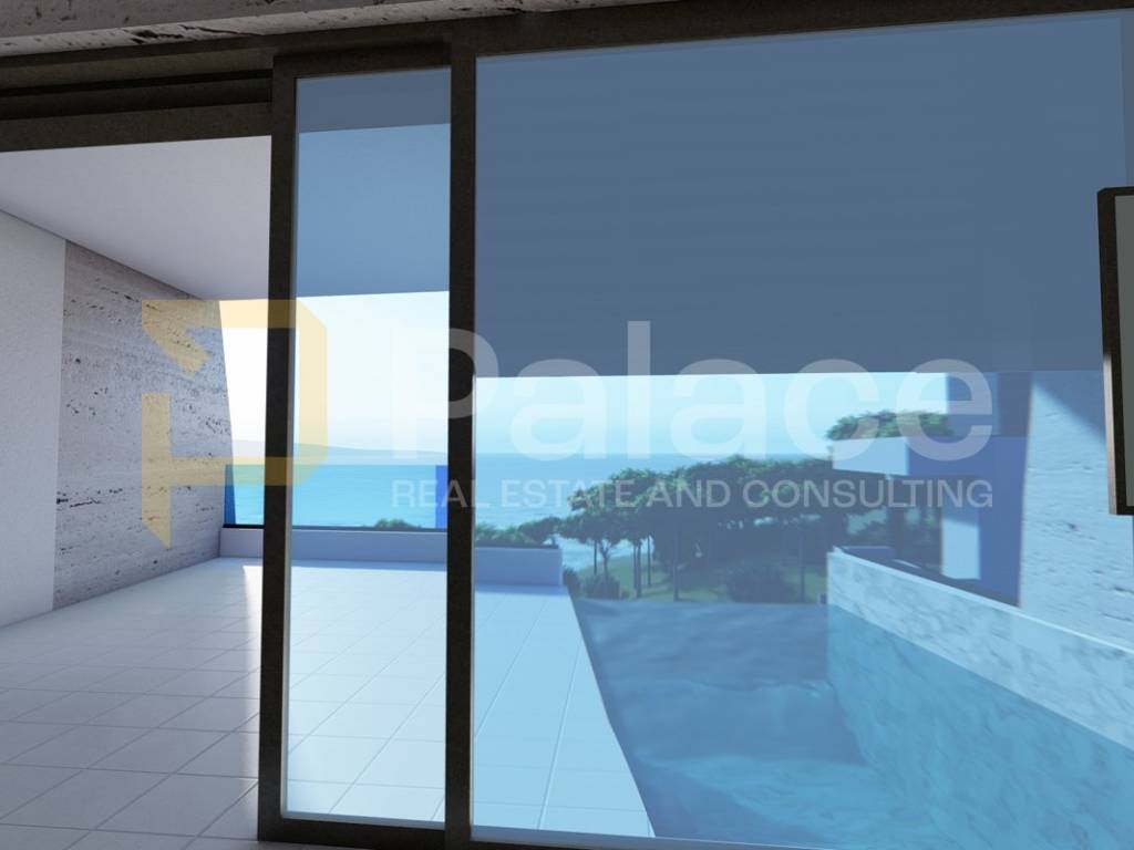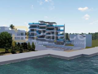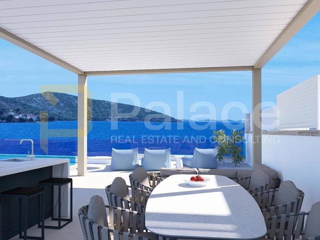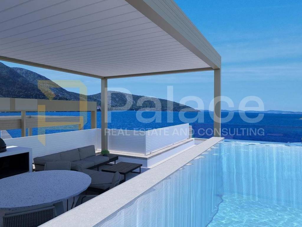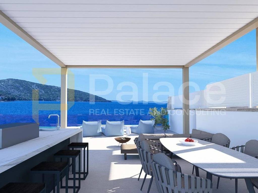 Situated right on the coast, only 40 m from the sea, with a private pool and luxurious furnishings, this apartment offers the future owner the maximum pleasure of enjoyment. The building is constructed to high building standards, using quality materials, and the apartments are equipped with PVC windows with large sliding doors, air-conditioned rooms, electric blinds with mosquito nets, underfloor heating, etc. The whole building is connected with an elevator.