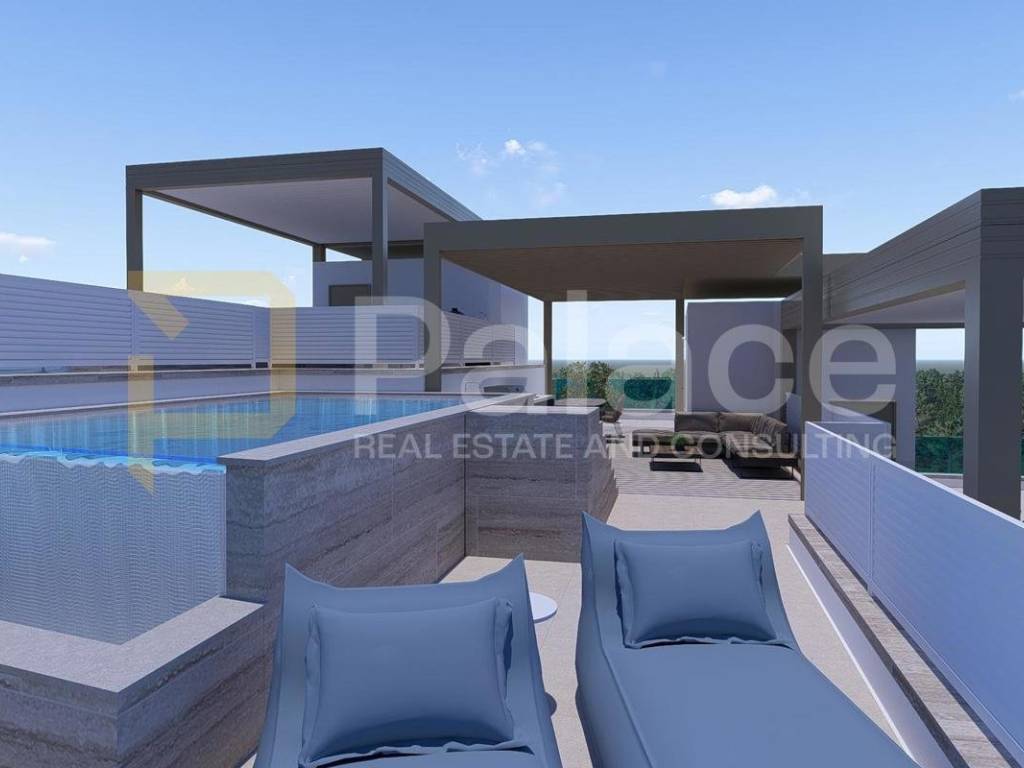 This apartment is located on the second floor of the building and covers an area of 84.88 m2. It consists of two bedrooms, a bathroom, a separate toilet, and a living area that combines a kitchen with a dining area and a living room. From the living room, you have access to a beautiful outdoor terrace of 22.82 m2, while stairs lead to the roof terrace with a private pool. The apartment also includes two garage spaces, a storage room, and an uncovered outdoor parking space.