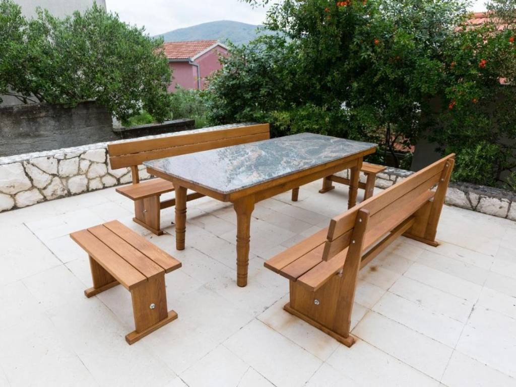 On one part of the property, there are two barbecue grills and large tables for socializing outside the apartments.
