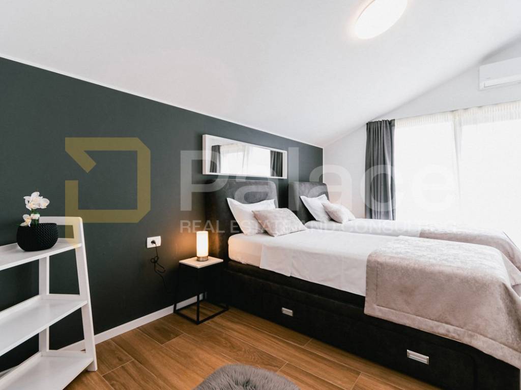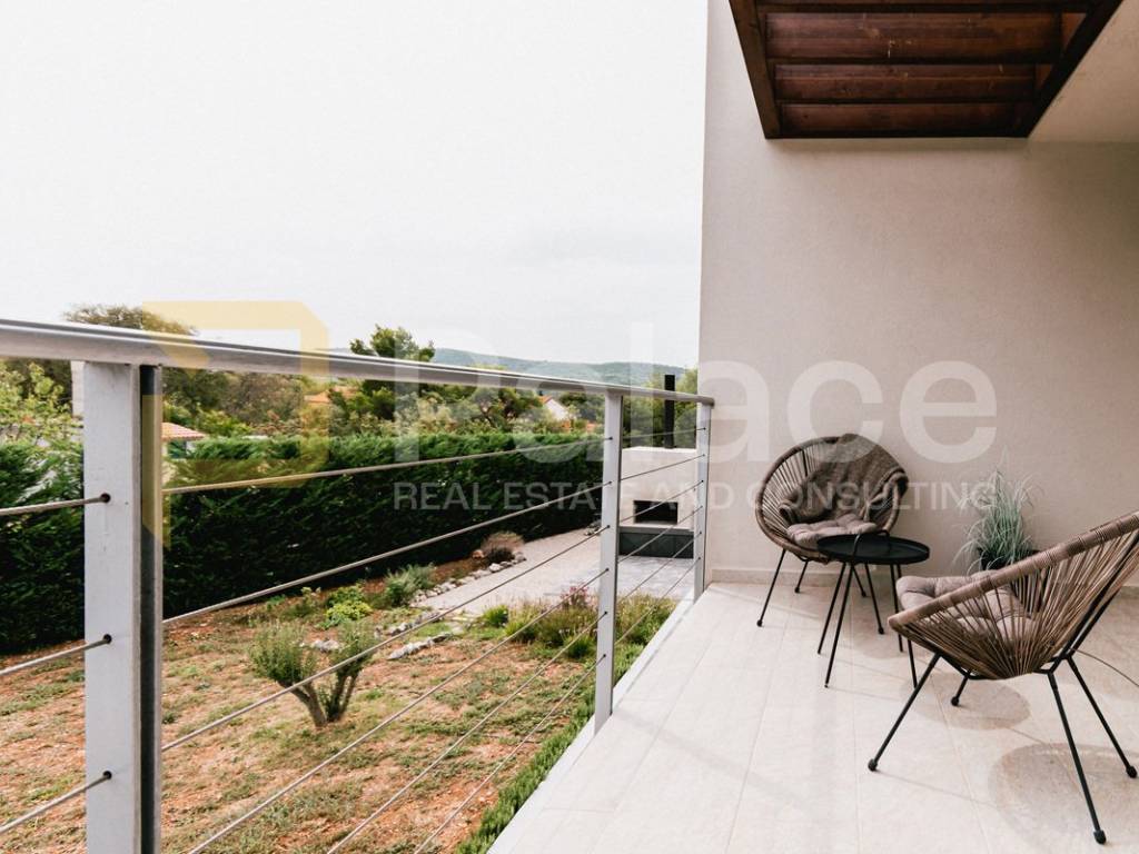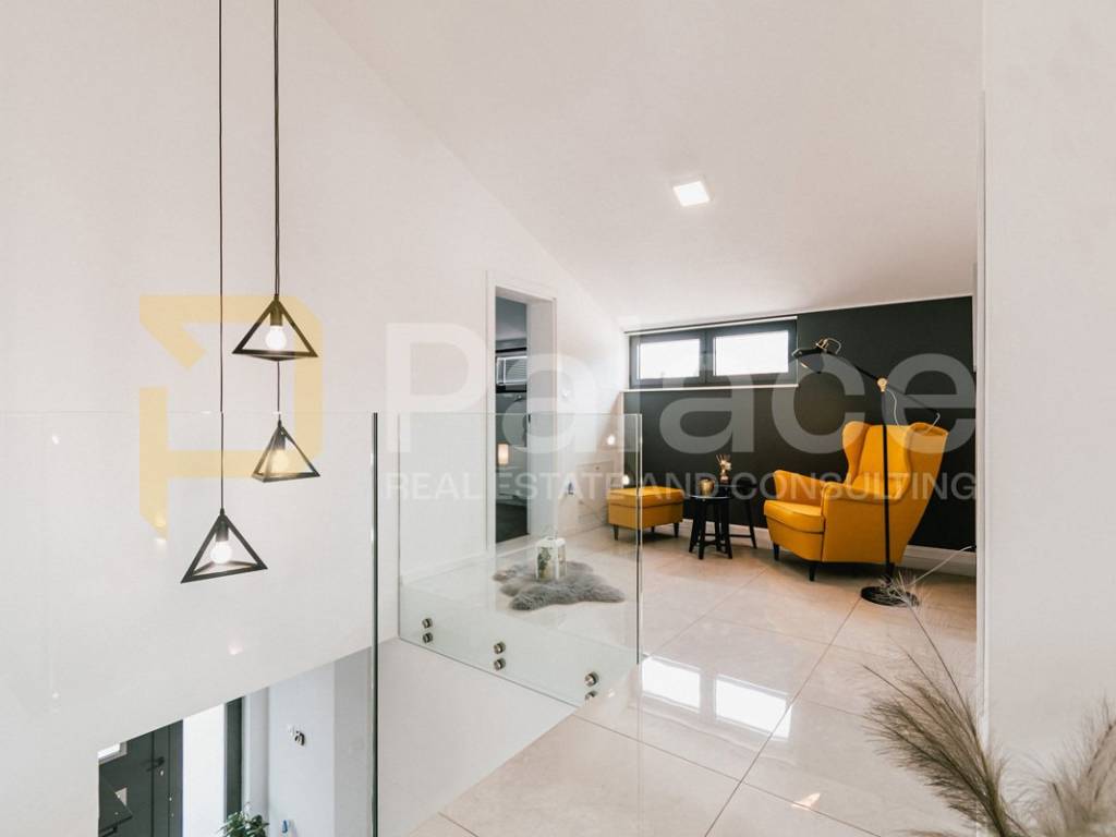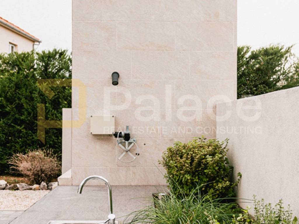 The villa is fully and modernly furnished, equipped with underfloor heating in each room with separate temperature control thanks to a heat pump. Each room also has air conditioning, along with video surveillance, and the surroundings benefit from automatic underground irrigation.