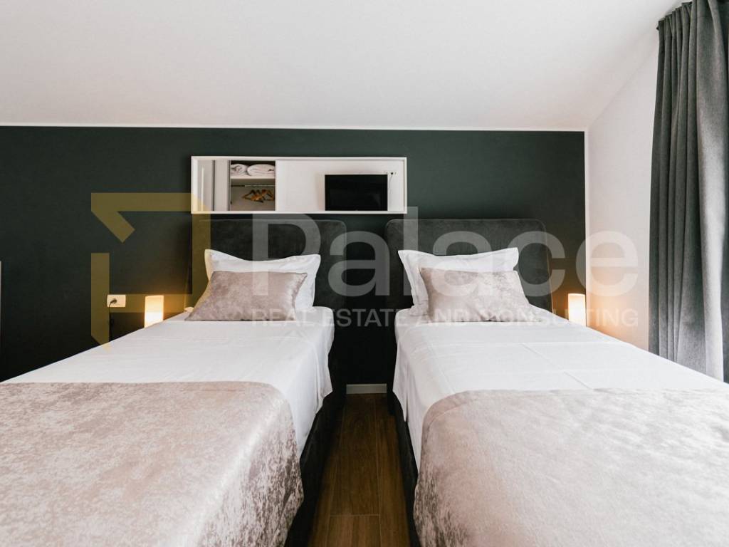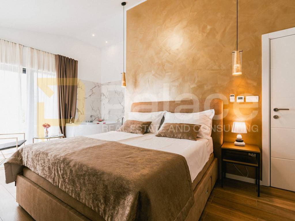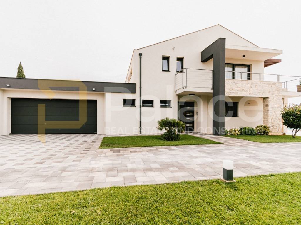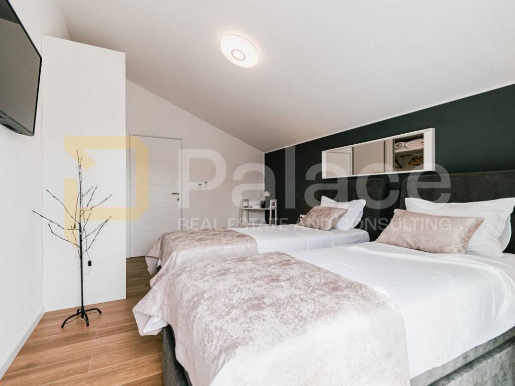 The villa is fully and modernly furnished, equipped with underfloor heating in each room with separate temperature control thanks to a heat pump. Each room also has air conditioning, along with video surveillance, and the surroundings benefit from automatic underground irrigation.