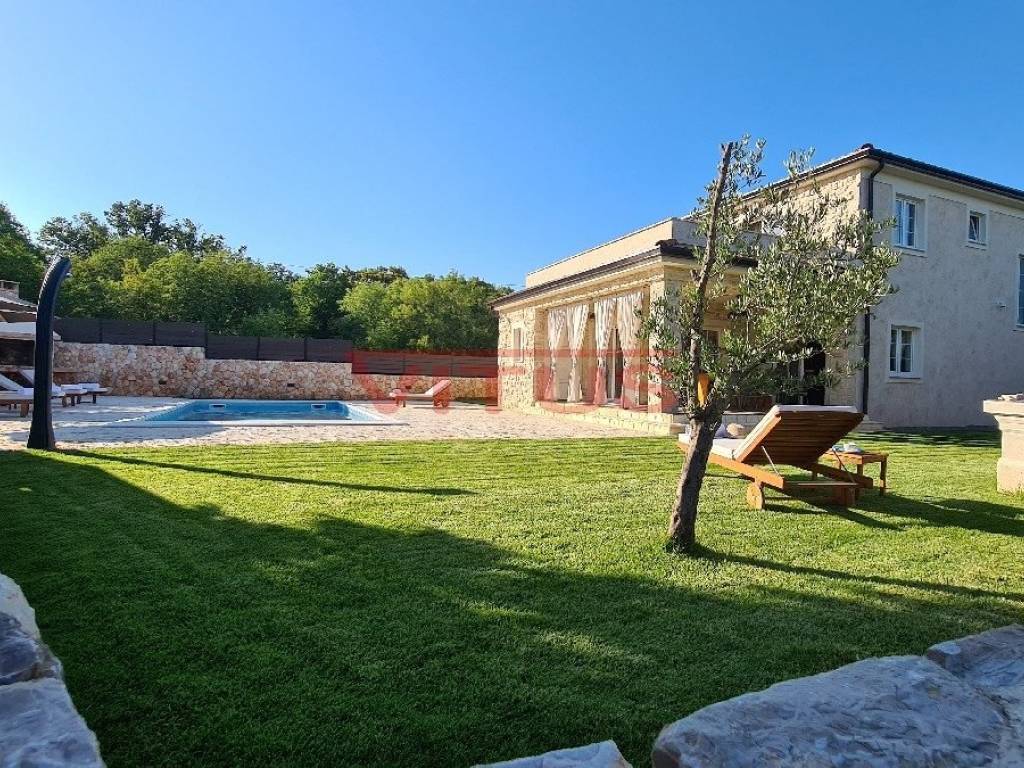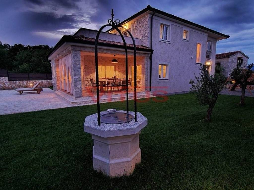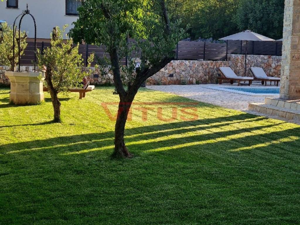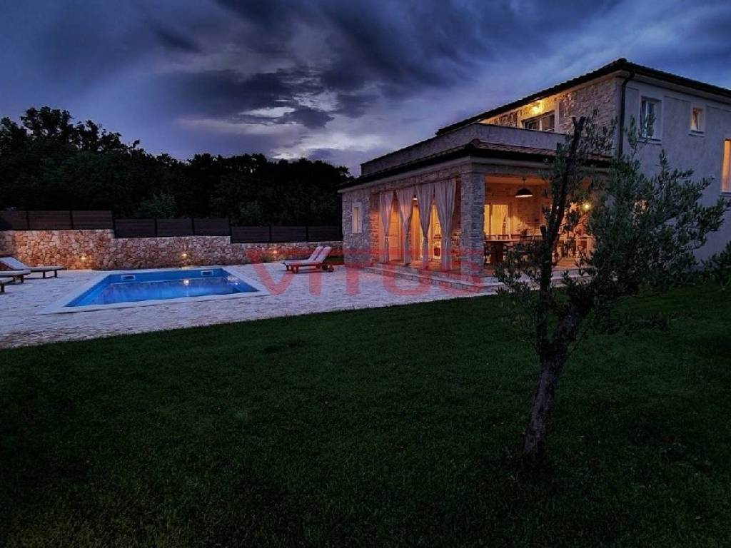 A luxurious detached villa with a total living area of 168 m2, on a plot of 802 m2, is located in a quiet part of the island, near Dobrinj, 3500 m from the sea. In the spacious garden there is a barbecue, a heated pool of 36 m2 with a sunbathing area and a spacious green area with irrigation. The villa is equipped with ALU PVC joinery, air conditioning in all rooms, underfloor heating and video surveillance. The ground floor consists of a hallway, bedroom, bathroom, kitchen, dining room, living room, two toilets and a storage room, and on the first floor of three bedrooms, three bathrooms and a spacious terrace of 35 m2. It is sold fully furnished and has five parking spaces.