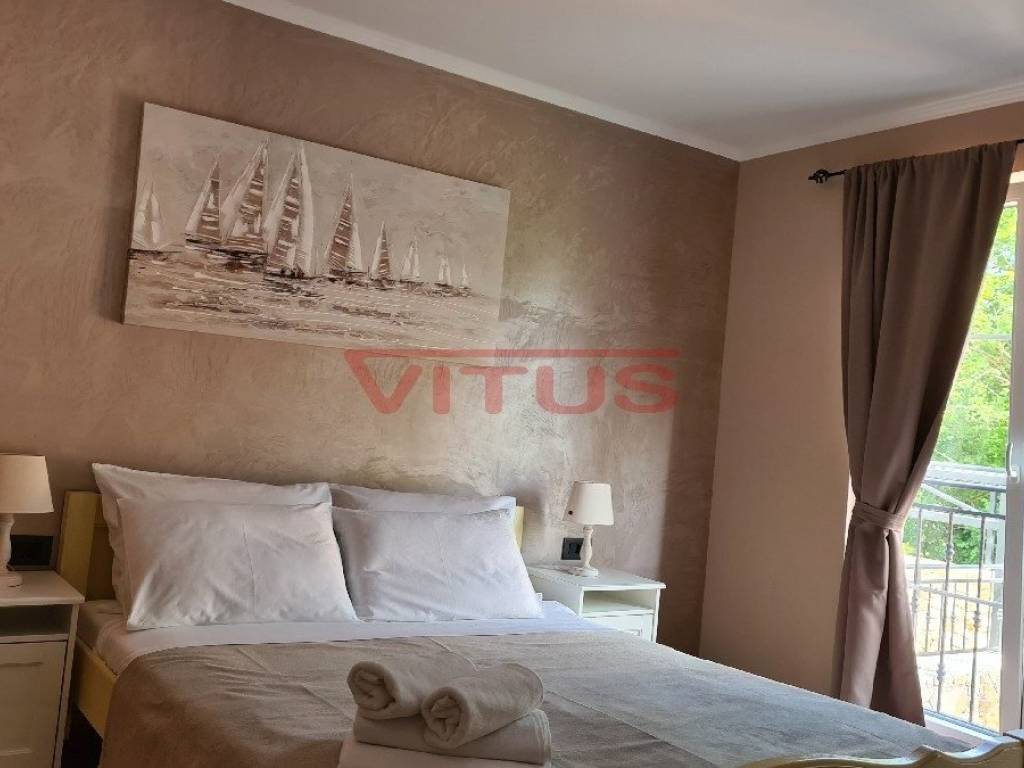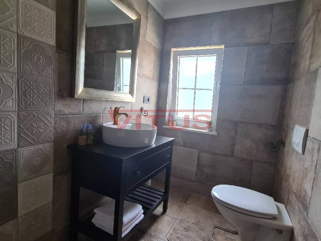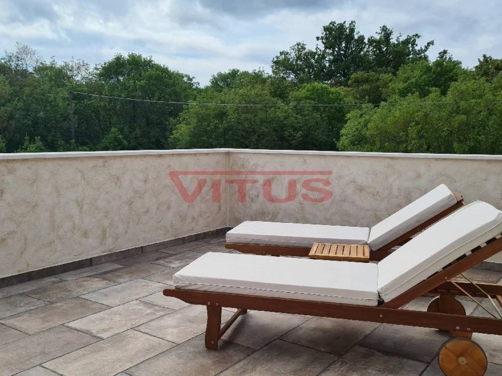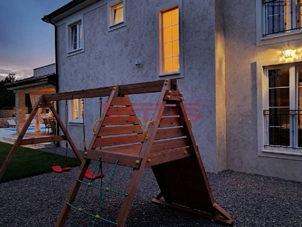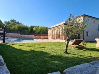 A luxurious detached villa with a total living area of 168 m2, on a plot of 802 m2, is located in a quiet part of the island, near Dobrinj, 3500 m from the sea. In the spacious garden there is a barbecue, a heated pool of 36 m2 with a sunbathing area and a spacious green area with irrigation. The villa is equipped with ALU PVC joinery, air conditioning in all rooms, underfloor heating and video surveillance. The ground floor consists of a hallway, bedroom, bathroom, kitchen, dining room, living room, two toilets and a storage room, and on the first floor of three bedrooms, three bathrooms and a spacious terrace of 35 m2. It is sold fully furnished and has five parking spaces.
