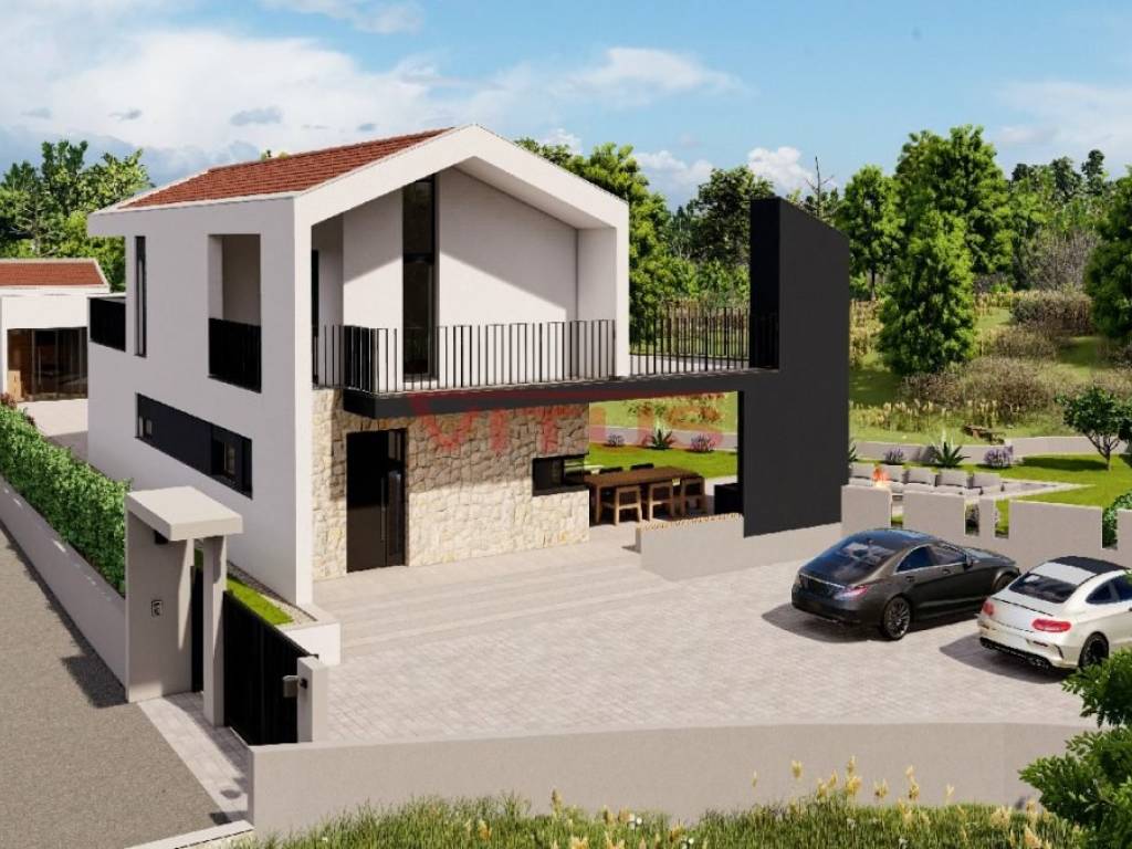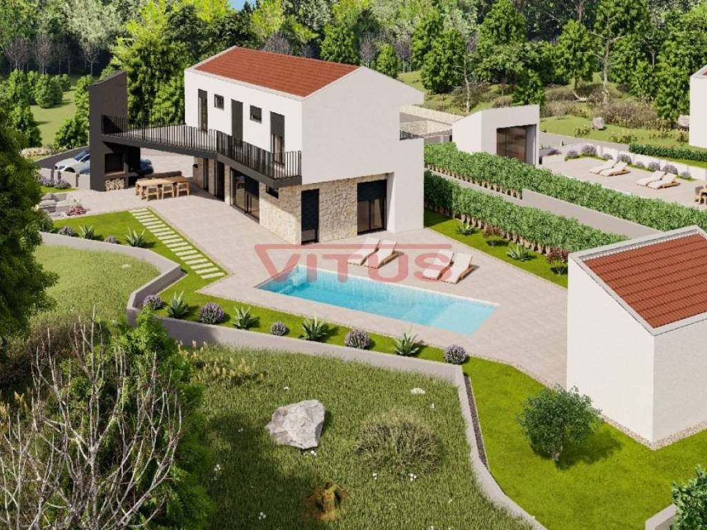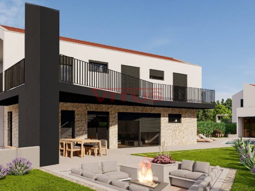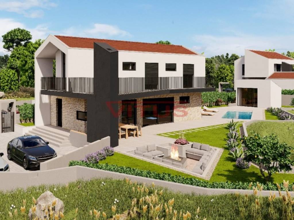 This luxurious modern villa of 237,69 m2 is located in a quiet area in the wider surroundings of Malinska on a plot of 880 m2. It consists of ground and first floor. The ground floor consists of an entrance area, kitchen with a dining room and a living room and access to a covered terrace, one bedroom with its own bathroom and access to an uncovered terrace, a technical room and a toilet. There are three bedrooms on the first floor, two share a bathroom and also have access to a nice terrace, while the master bedroom has its own bathroom and access to a private balcony. On the spacious garden of 504 m2, there is a heated pool of 46 m2 with a sunbathing area, a lounge area with a fire pit in the middle, an outdoor fireplace, a parking space for two cars, and an auxiliary building of 22.5 m2, which consists of basement and ground floor. On the ground floor o15 m2 is for SPA area with sauna, jacuzzi and wellness for relaxation, and the remaining 7.5 m2 in the basement of the building is intended for storage. The villa is equipped with high-quality equipment, which includes high-quality carpentry, floor coverings made of high-quality ceramics and natural stone, high-quality sanitary facilities, ceiling air conditioning and underfloor heating with a heat pump. The villa is currently under construction, and the completion of the works is expected in 2024.