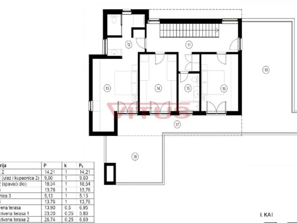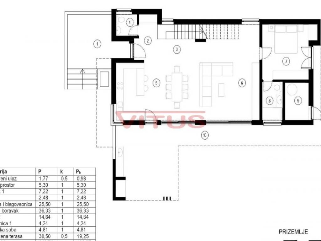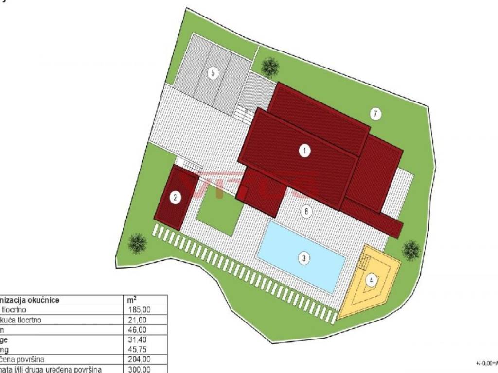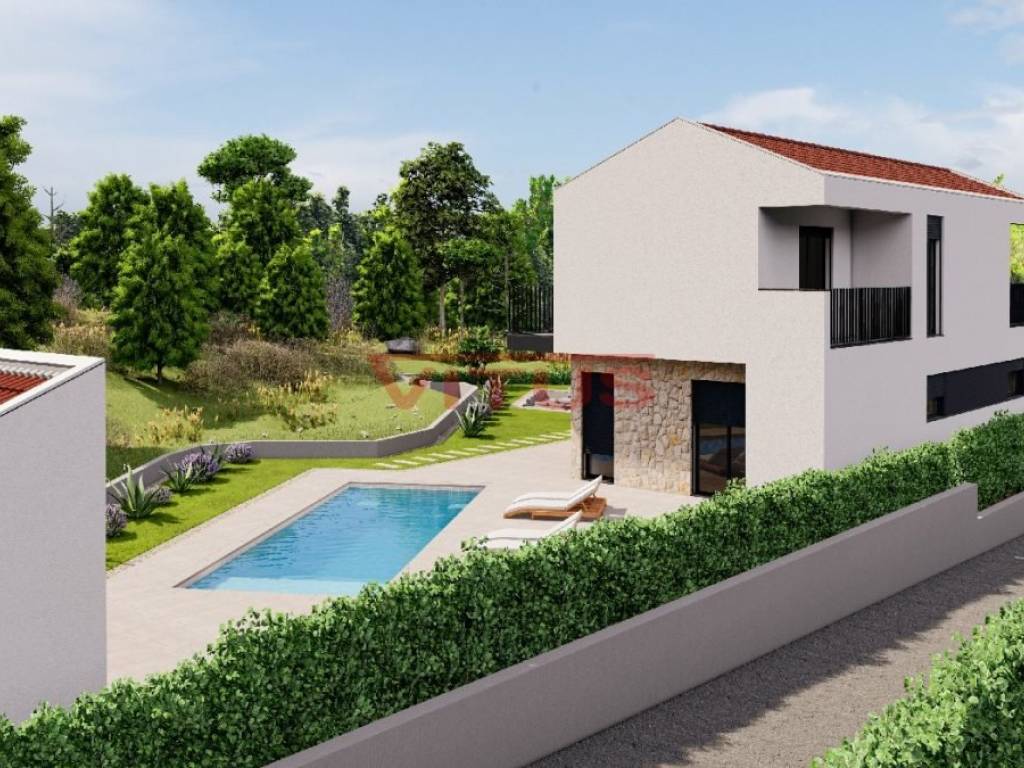 This luxurious modern villa of 237,69 m2 is located in a quiet area in the wider surroundings of Malinska on a plot of 880 m2. It consists of ground and first floor. The ground floor consists of an entrance area, kitchen with a dining room and a living room and access to a covered terrace, one bedroom with its own bathroom and access to an uncovered terrace, a technical room and a toilet. There are three bedrooms on the first floor, two share a bathroom and also have access to a nice terrace, while the master bedroom has its own bathroom and access to a private balcony. On the spacious garden of 504 m2, there is a heated pool of 46 m2 with a sunbathing area, a lounge area with a fire pit in the middle, an outdoor fireplace, a parking space for two cars, and an auxiliary building of 22.5 m2, which consists of basement and ground floor. On the ground floor o15 m2 is for SPA area with sauna, jacuzzi and wellness for relaxation, and the remaining 7.5 m2 in the basement of the building is intended for storage. The villa is equipped with high-quality equipment, which includes high-quality carpentry, floor coverings made of high-quality ceramics and natural stone, high-quality sanitary facilities, ceiling air conditioning and underfloor heating with a heat pump. The villa is currently under construction, and the completion of the works is expected in 2024.
