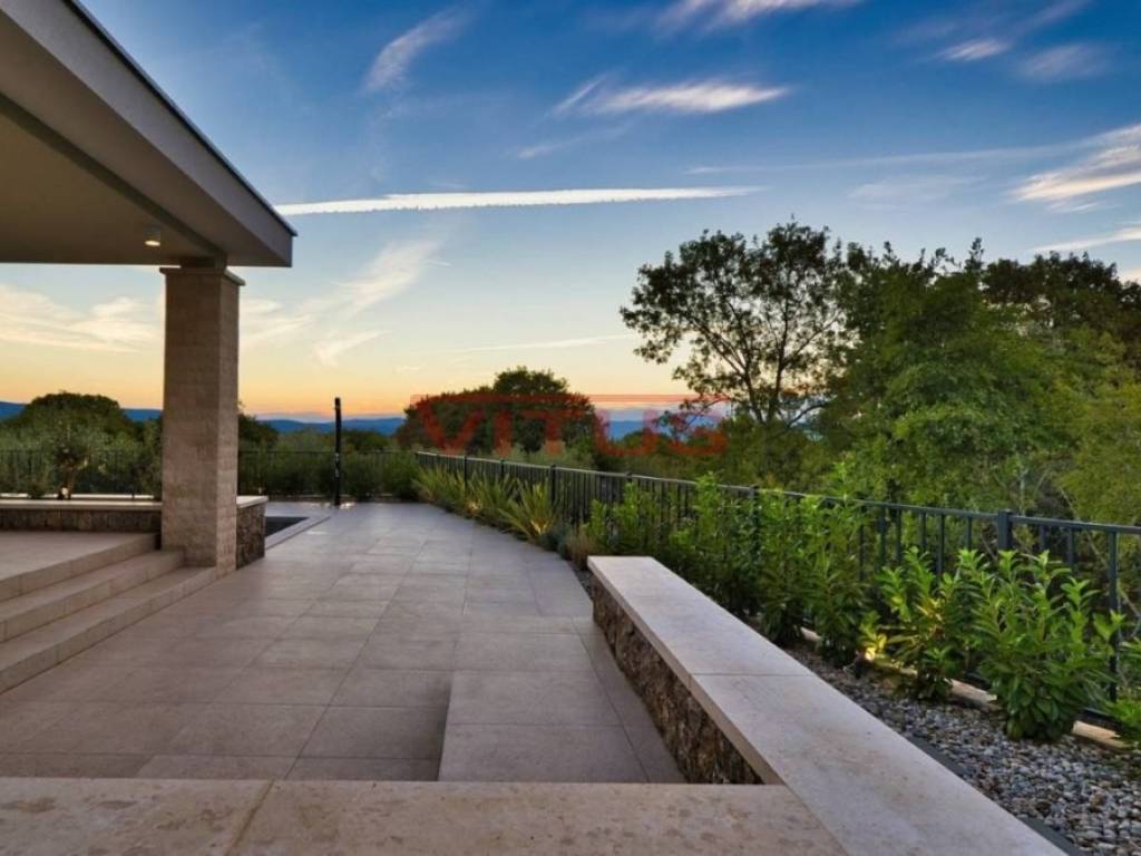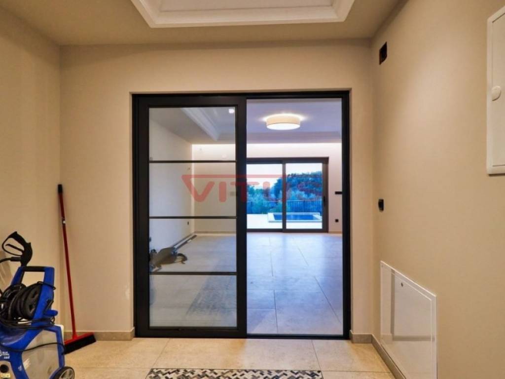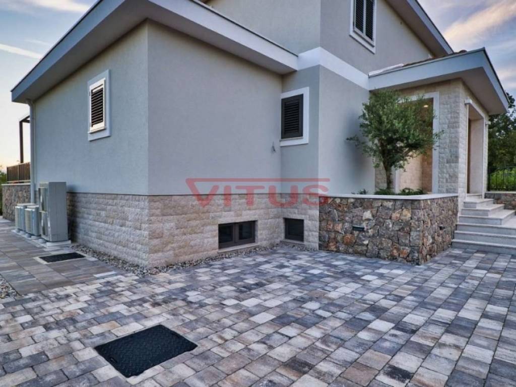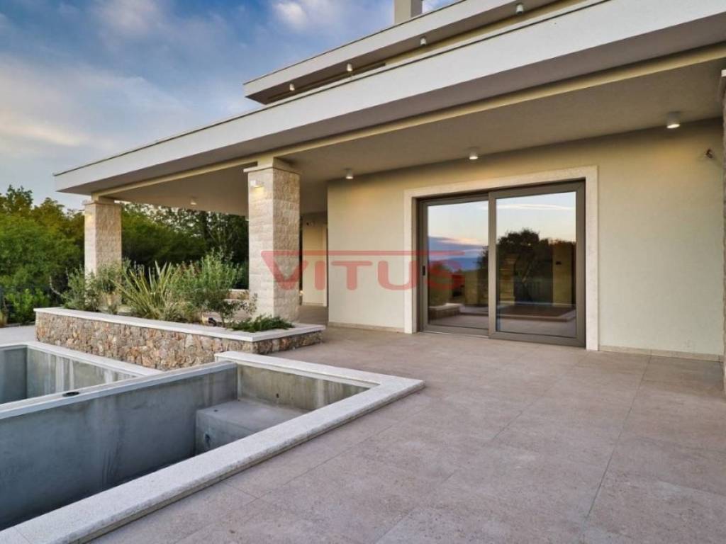 A modern mediterranean villa, with a total living space of 324 m2, is located in a quiet part of the Malinska. It consists of a basement, ground floor and first floor. In the basement there is a sauna, a social area, a gym and a toilet. The ground floor consists of a kitchen with a dining room, a pantry, a spacious living room, a toilet and a bedroom with its own bathroom. The living room has access to a covered terrace. On the first floor there are three bedrooms with their own bathrooms. Two bedrooms have access to a shared terrace with a beautiful sea view. There is a swimming pool with a sunbathing area, a summer kitchen, and parking for several vehicles on the beautifully landscaped garden. Quality construction and equipment, air conditioning, top quality ceramics, solid fuel fireplace, PVC joinery. It is sold unfurnished. In a quiet part of the Malinska area, 2000 m from the sea.