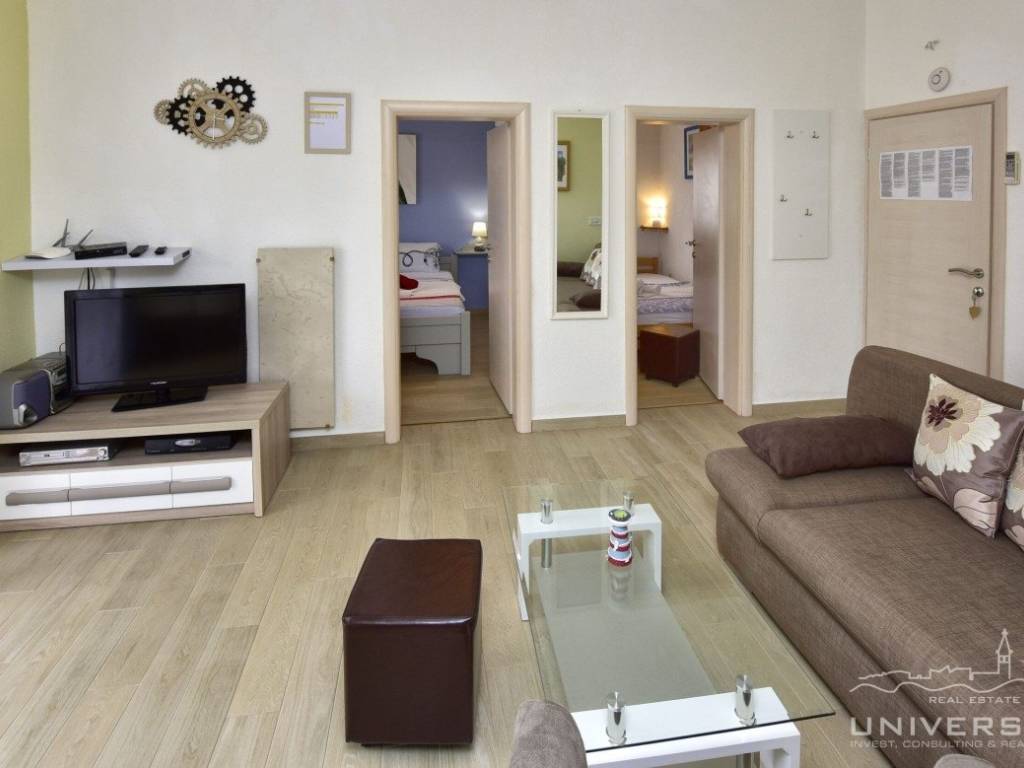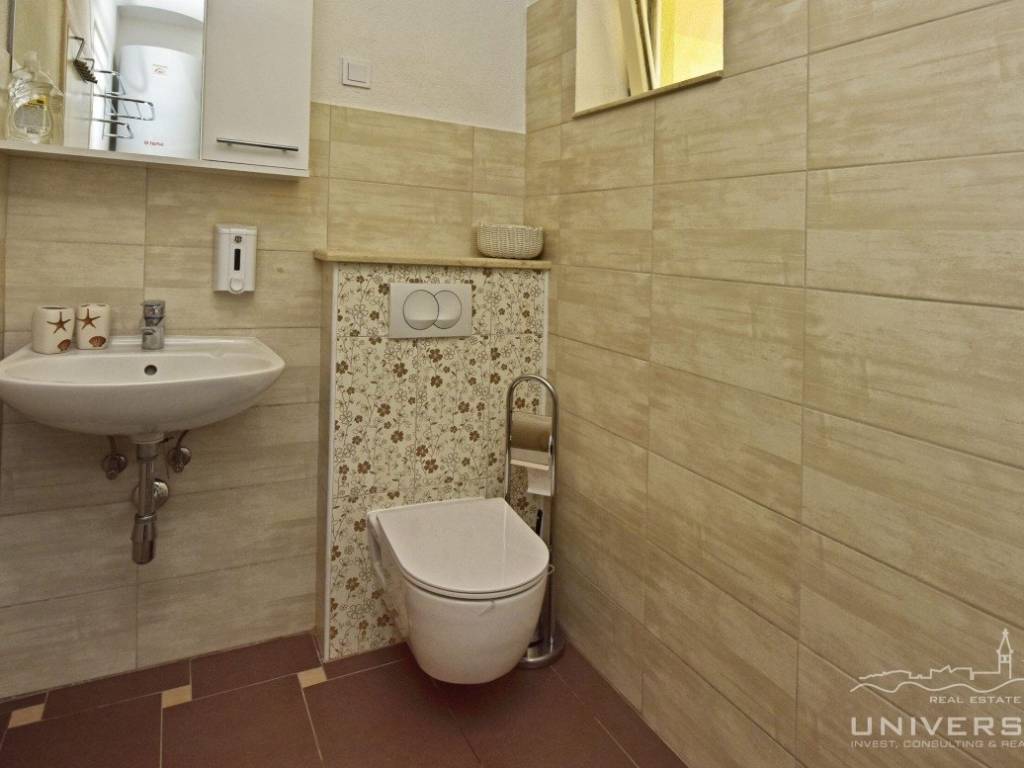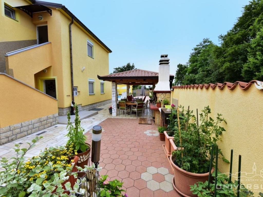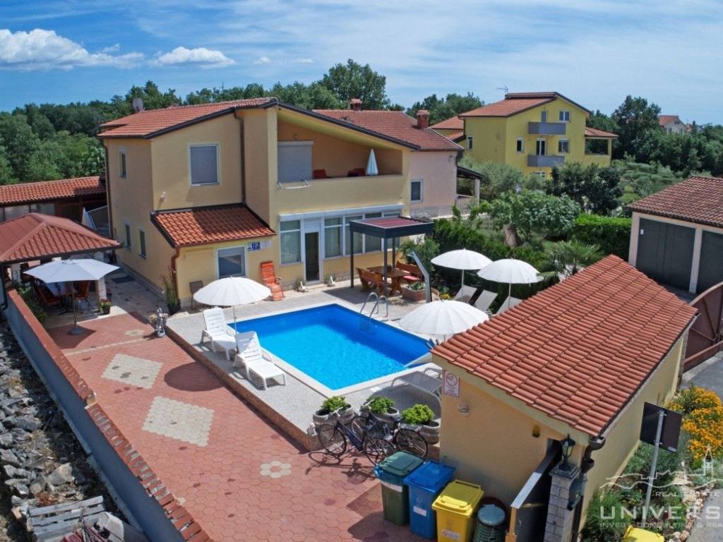 This apartment house with a total of five apartments is for sale in the vicinity of Poreč. The house has two floors: there are three apartments on the ground floor and two apartments on the first floor. Each apartment has two bedrooms, bathroom, kitchen with dining room and living room with access to the terrace. Heating/cooling is solved by air conditioning. In the yard of this beautiful house there is a swimming pool and a summer kitchen. Due to its location, the house can be used for residential and tourist purposes.