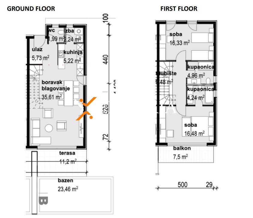 Ground floor: entrance, toilet, kitchen, storage room, living room, dining room, terrace