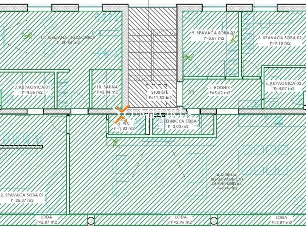 This is a second-floor apartment. The room layout consists of a hallway, a bedroom with bathroom, two other bedrooms, a bathroom, a laundry room, toilet, a kitchen with dining and living room, fitness and game-room, sauna and a loggia. The area of the described is 153.21 m2. The apartment also includes a garage parking space, an outdoor parking space and a storage room in the basement.