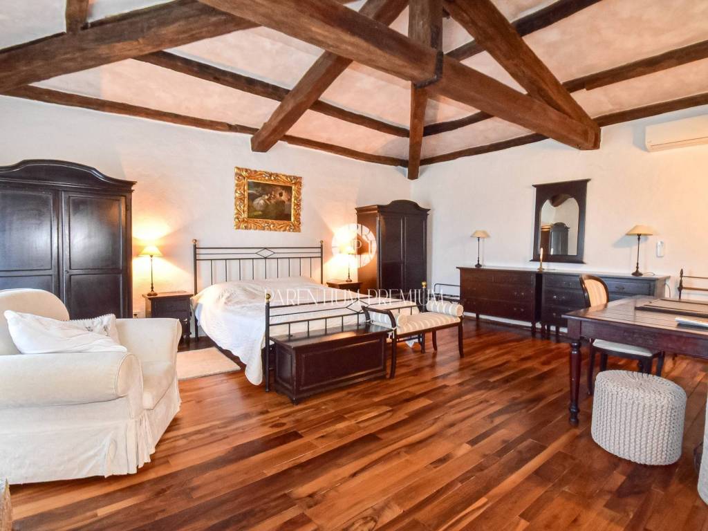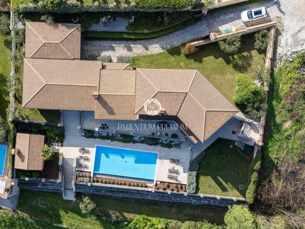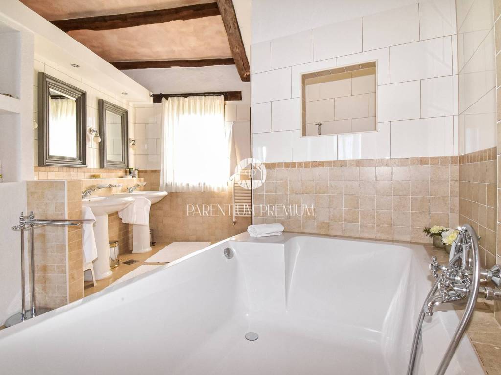 The landscaped garden offers a swimming pool, a summer kitchen and several outdoor relaxation areas. The property is equipped with central heating, fireplaces and air conditioning, and includes three covered parking spaces.