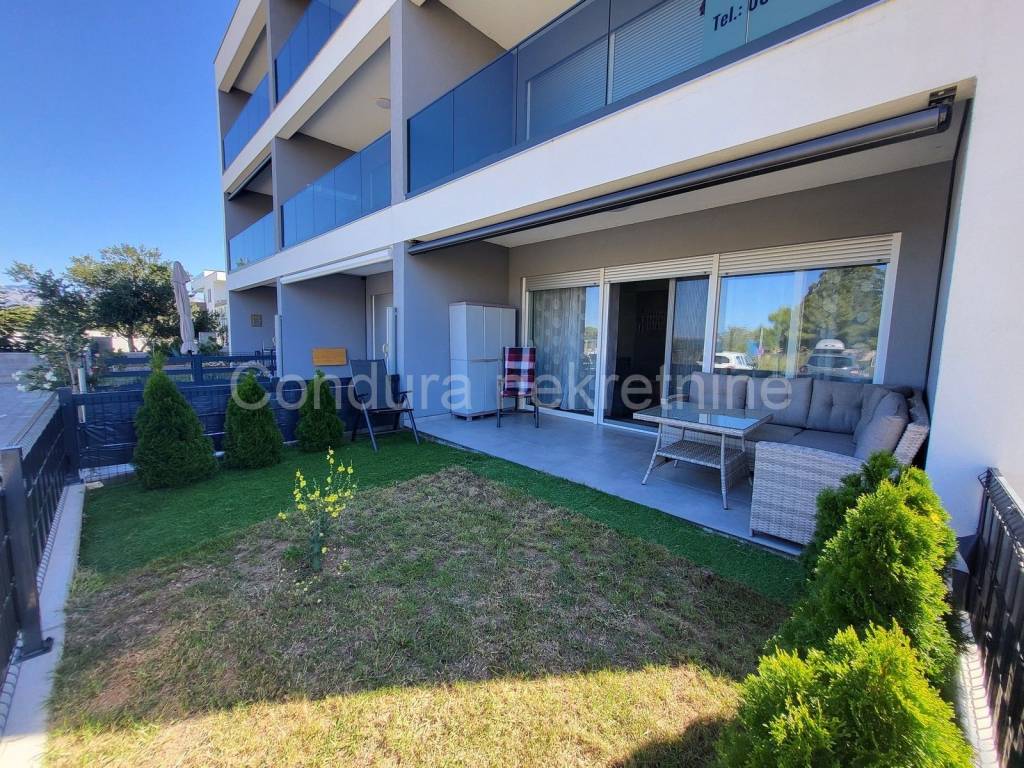 A beautifully decorated and furnished two-bedroom apartment with a private garden is for sale, just 100 m from the sea and the beach. The apartment is located on the ground floor of a residential building and consists of: a living room with a kitchen and dining room, a hallway, two bedrooms and a bathroom. The living room opens onto a covered terrace (9.90 m2) and a garden (15.00 m2), which is arranged as a green area. Equipment:
