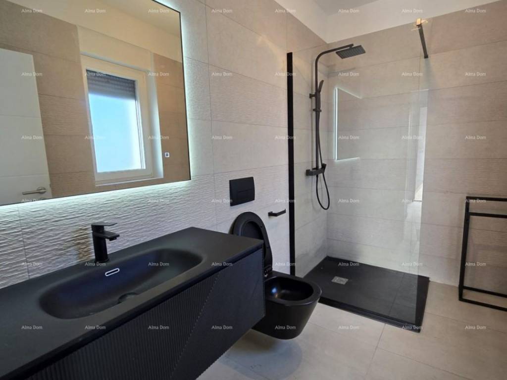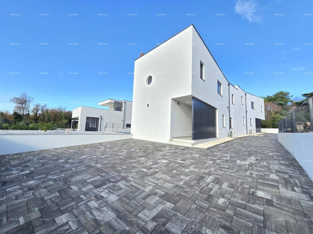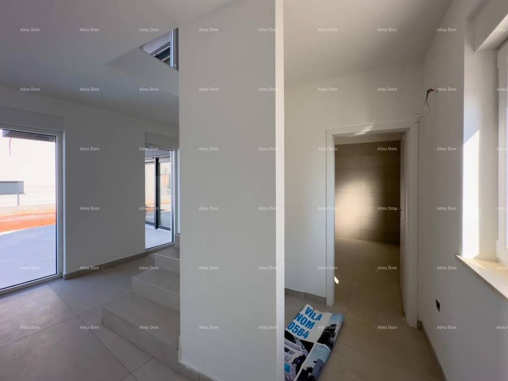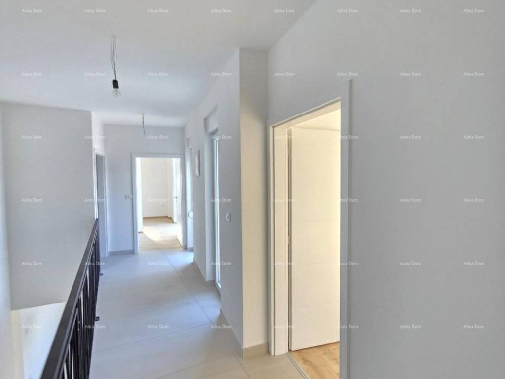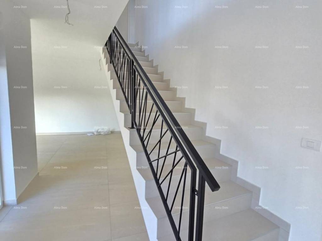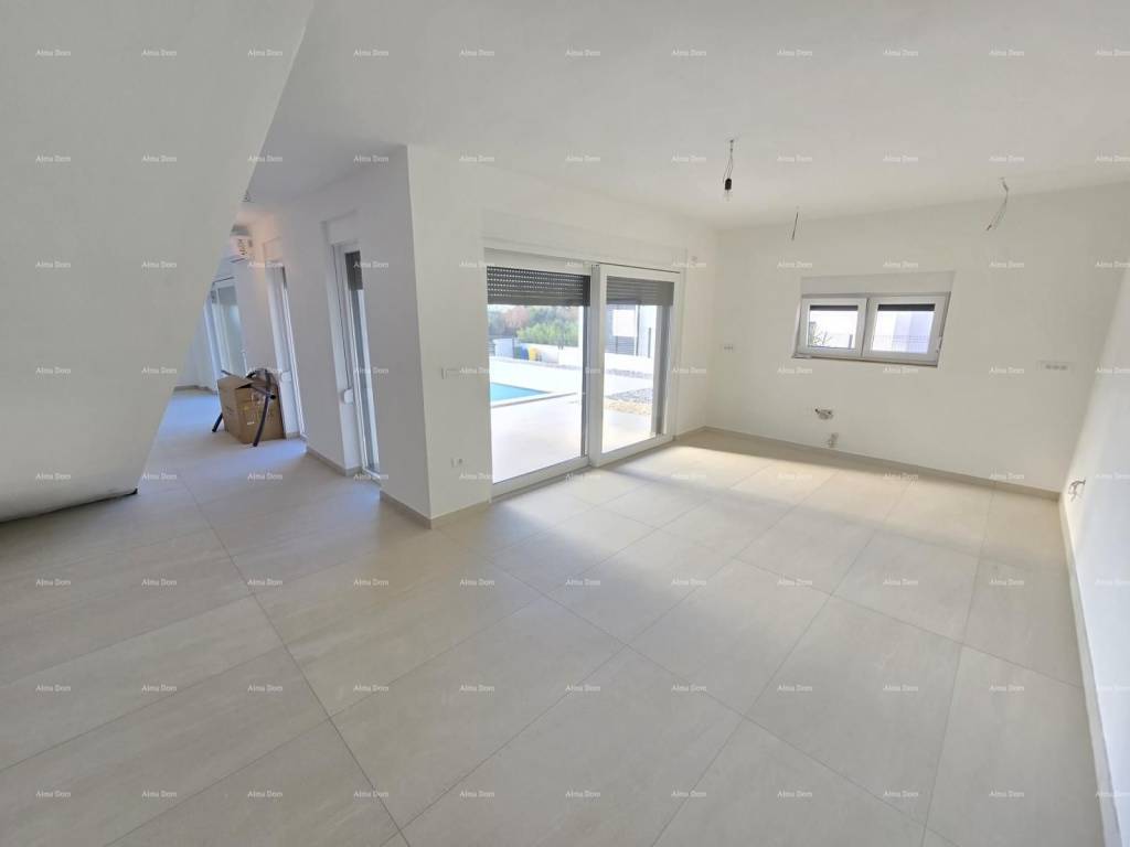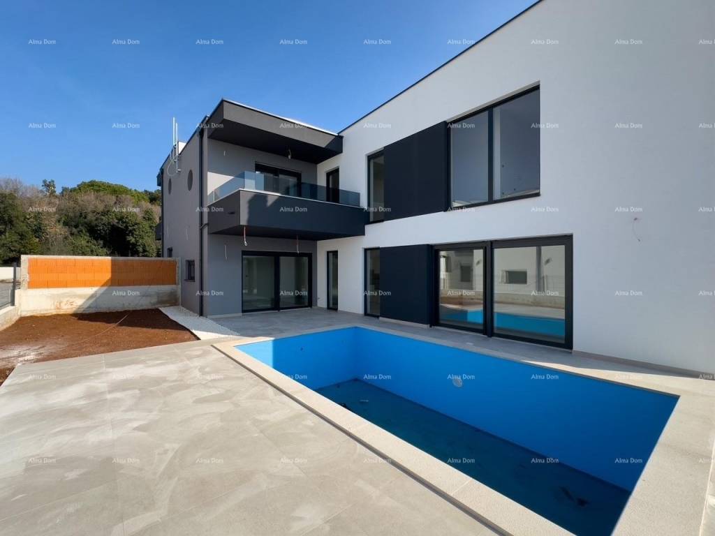 For sale is a new house with a pool measuring 155 m2. The house features a living room, kitchen, dining area, bedroom, and bathroom on the ground floor. The upper floor includes 2 bedrooms, a bathroom, and a storage room. One of the bedrooms opens onto a spacious terrace. The ground floor leads directly to the pool. The yard is approximately 550 m2.