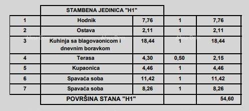 Apartment H1 consists of an entrance hall, living room with kitchen and dining area, 2 bedrooms, bathroom, utility room and terrace.