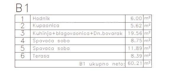 APARTMENT - B1 is located on the 1st floor of the building and consists of: a hallway, bathroom, kitchen + dining area, living room, 2 bedrooms, and a terrace. Total net area: 60.21 m