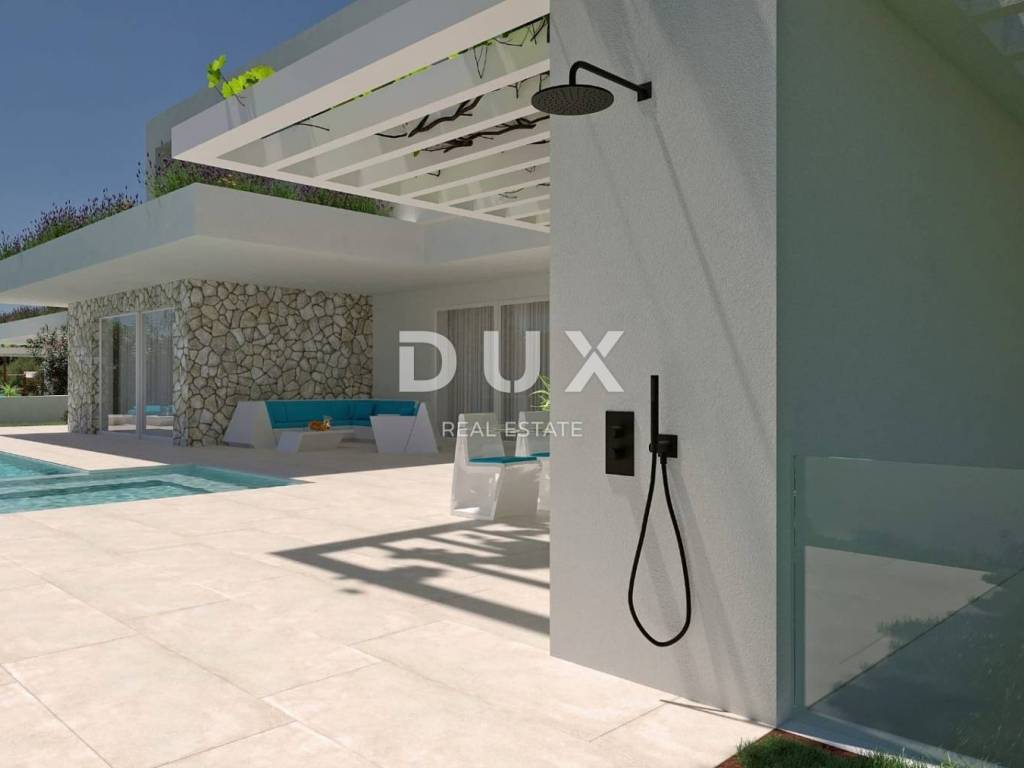 Not far from charming Poreč is this luxurious modern villa for sale with a swimming pool and a spacious garden, located in front of a green area where no further construction is allowed, ensuring privacy and peace.