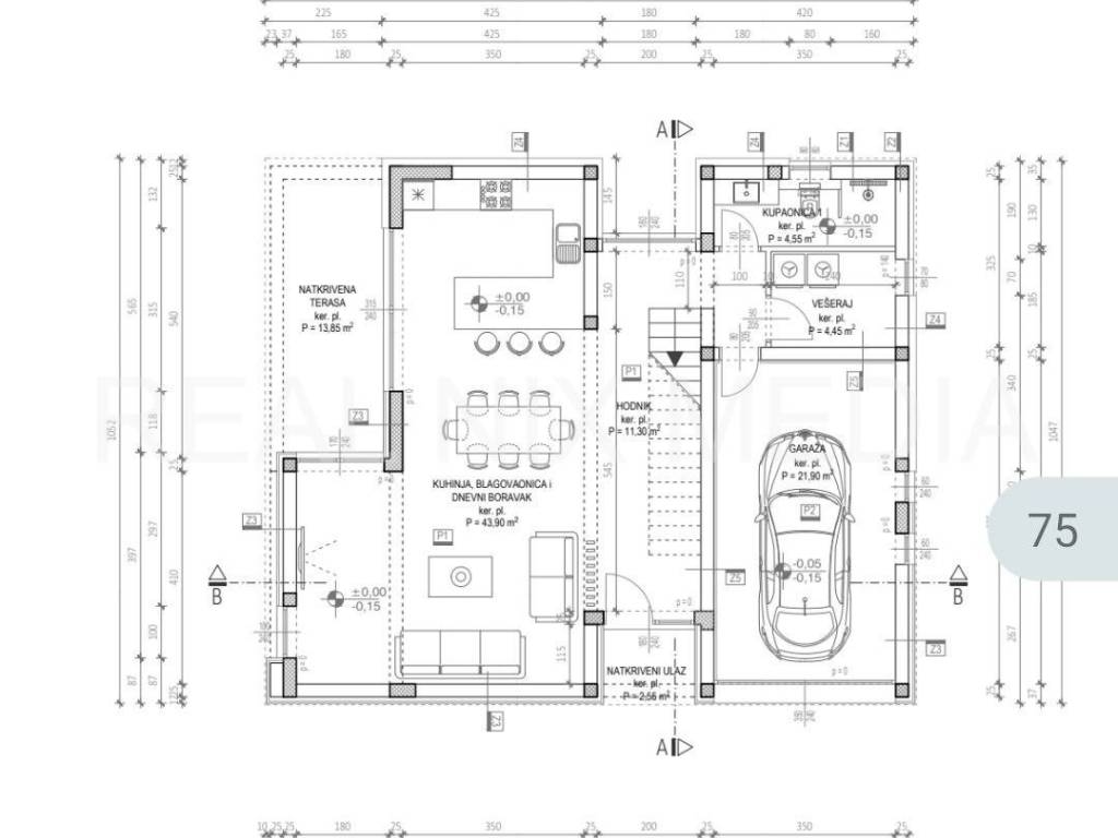 U prizemlju se nalazi prostrani open space dnevni boravak povezan s kuhinjom i blagovaonicom, kupaonica, praktičan vešeraj te garaža. Velike staklene stijene otvaraju dnevni dio prema terasi i bazenu, stvarajući prirodnu povezanost unutarnjeg i vanjskog prostora.