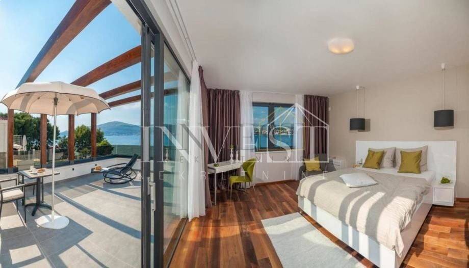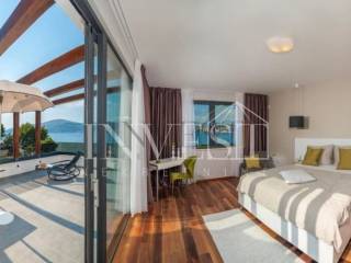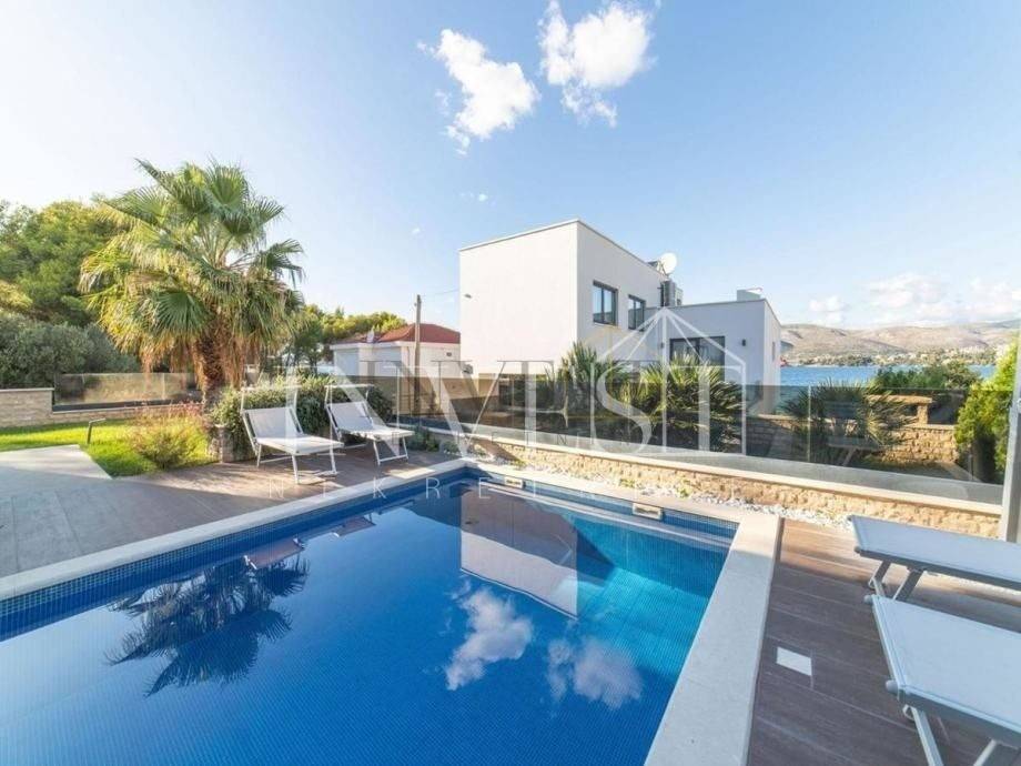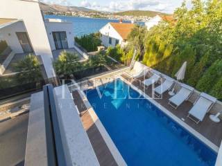 The newly renovated and luxurious Villa is located in Čiovo, 50 meters from the beach. The 350 m2 property includes an outdoor and indoor pool with a wellness area and a fitness room. In the basement there is a living room with a kitchen, a bathroom, two bedrooms each with its own bathroom, and on the ground floor there are three bedrooms with their own bathrooms. There is also a bedroom with its own bathroom on the first floor. Distance to Split Airport is 10 km, Trogir 5 km and Split 30 km.