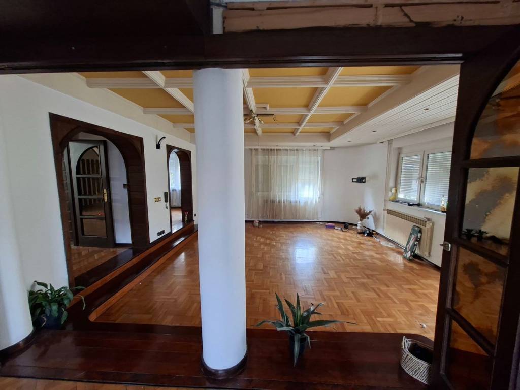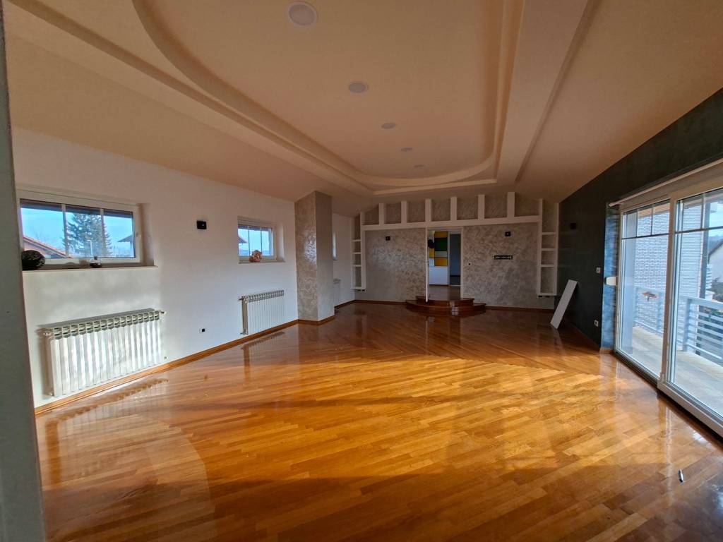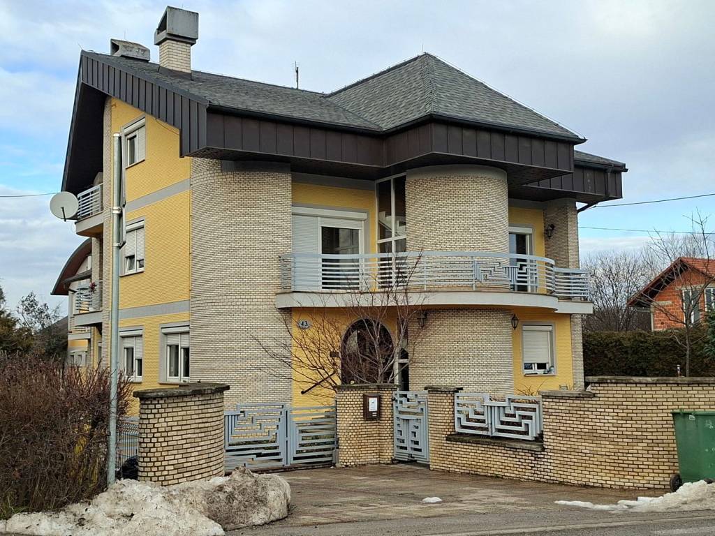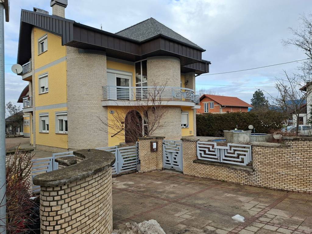 VISOKOPRIZEMNA VILA orginalno građena 1989.g., dim 15.20 x 11.10 m2, tlocrtne površine 215 m2 x 3 etaže (prizemlje, kat i potkrovlje) rekonstruirana je 1997 g. te dograđena dvorišna zgrada (prizemlje +kat) 2000 g. ukupne površine iznad 300 m2 (priz+ kat) u kojoj se nalaze bazen, fitness, sauna, 2 garaže, te u svakoj etaži odgovarajući sanitarni dio sa tuševima i toaletima; povezano sa glavnom građevinom, zajedno sa dvorištem (fontana, sjenica, roštilj,..) i teniskim igralištem nalaze se na parceli od 2702 m2. Kvalitetna gradnja: armiranobetonski nadvoji, ploče, grede i stubišta; nosivi zidovi šuplja opeka 25-30 cm, pregradni- opeka 6-10 cm, žbukano grubom i finom žbukom: hidroizolacija vanjskih zidova i ulazne terase, stubišta i terasa-granit, ograde-željezo i čelik,.. PRIZEMLJE VPR Ulaz u glavni objekt je moguć preko opločane, povišene terase rađene od granita kasmir, stražnjim ulazom i vezom/sobom na katu dvorišnog objekta. Glavni ulaz i balkoni na katu izvedeni u ovalu i u kompletnoj staklenoj stijeni pružaju poseban doživljaj spoja unutarnjeg i vanjskog prostora. U PRIZEMLJU KUĆE nalazi se centralni dio- dnevni boravak i blagavaona povezani u jedinstvenu cjelinu povr cca 50 m2 oplemeljeni poluetažama i stupovima; soba, kuhinja, kupaonica i toalet zasebno te ulazni hol sa stubištem u kamenom granitu i ogradi čeličnih stupova sa drvenim rukohvatima do gornjeg kat i potkrovlja. KAT sadrži 4 sobe: 2 sobe sa staklenom stijenom i izlazom na ovalnu terasu, vrlo komfornu spavaću sobu sa ugrađenom garderobom i ormarima, kupaonicu sa jakuzzi-em te još jednu sobu koja ujedno povezuje kuću sa dvorišnom zgradom. Centralno grijanje provedeno u sve dijelove stambenog i rekreacijskog dijela, sve vrlo uredno održavano i servisirano. Podovi u prostorijama sukladno namjeni: kvalitetni hrastov parket I klase, 2 cm u sobama te keramika. Zidovi gletani i ličeni. Tavan do kojeg vodi uređeno stubište (stupovi čeličnog profila, drveni rukohvat) prostire se iznad cijelog prostora gornjeg kata- uredan i pogodan za uređenje još jedne etaže. Krov- dvostrešan i u dijelu ovalan, potpuna izolacija; pokrov- bitumenska šindra tegola, oluci, okapnice i svi opšavi kao i dimnjaka-bakreni lim DVORIŠNA ZGRADA ukupne površine preko 300 m2 sadrži :PRIZEMLJE-ukupne površine 157 m2 i uključuje: ulazni predprostor, spremište ogrijeva, kotlovnicu, 2 garaže, spremište, garderobu, sanitarni čvor i zatvoreni bazen veličine 6 x 8 m. Prostor za rekreaciju u potpunosti je opskrbljen svim sadržajima, staklena stijena oko cijelog bazena sa pogledom na zelenilo, ukrasno drveće i staze parka, klupice za odmor unutar i izvan objekta, sve popločano; sanitarni dio sa tuševima i toaletima (muški i ženski) i stubištem za KAT povr 102 m2, koji sadrži: fitnes, saunu, sanitarni čvor, spremište, balkon, loggia, stubište, te komfornu, svijetlu prostor/sobu za boravak gostiju i prigodna okupljanja povr cca 50 m2 koja povezuje dvorišni objekt sa glavnom kućom. Stolarija nova- kvalitetna PVC, kvalitetni hrastov parket I klase, 2 cm u sobama, KLIME, ograde na balkonima i loggiama- čelične cijevi i horizontalne prečke željezo, podovi- keramika. Unutrašnjost svih zidova i podova dovršena, kvalitetan hrastov parket, stubište kameni granit, zaštićeno sa drvenim rukohvatom. Kotlovnica sadrži sustav peći za sve vrste i mogućnosti grijanja kao i mogućnosti kombinacije istih: peć i rezervoar za lož ulje, peć i spremnik za pelet te peć na kruta goriva, sve u funkciji, redovito održavano i servisirano. Centralno grijanje cijevima i radijatorima u svim etažama.. Dvorište i okućnica je u potpunosti kultivizirana, opločena betonskim kockama u prilaznom dijelu svih objekata, mogućnost više parkinga te uređena travnatim dijelom i opločanim stazama koje vode do teniskog igrališta, drvene sjenice sa klupicama i roštiljem uz nju, te ukrasnim, egzotičnim drvećem za potpuni doživljaj užitka i relaksacije. Prednji dio također uređen kao travnata površinom sa različitim cvijećem te velikom fontanu od granit-kasmira u sredini Svi priključci: struja, voda, kanalizacija Asfaltnom prometnicom povezana sa ostalim dijelovima grada; osigurava posebno mirno življenje, a lokacija jamči dobru povezanost. ZBOG VELIČINE I UREĐENOSTI, KVALITETNE GRADNJE, SADRŽAJNOSTI OBJEKTA, MIRNE LOKACIJE, UREĐENE OKUĆNICE SA MOGUĆNOŠĆU VIŠE PARKINGA, SPORTSKIH SADRŽAJA- KUĆA PRUŽA RIJETKU I IDEALNU MOGUĆNOST KOMBINACIJE ODMORA, REKREACIJE, RELAKSACIJE I SADRŽAJNO BOGATO OBITELJSKOG ŽIVOTA KAO I RAZLIČITIH KOMBINACIJA STAMBENO-POSLOVNOG PROSTORA ILI IZVANREDNU MOGUĆNOST ZA RAZLIČITE INVESTICIJE