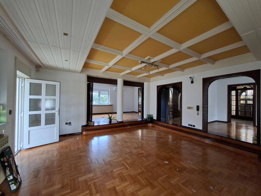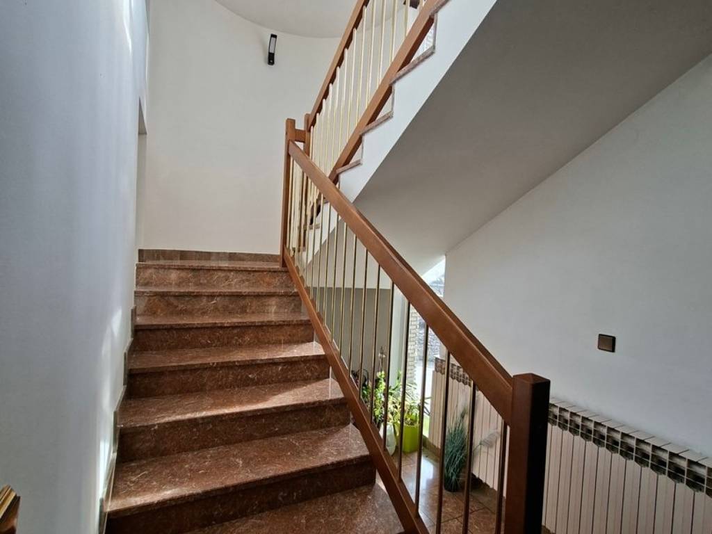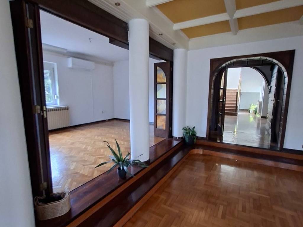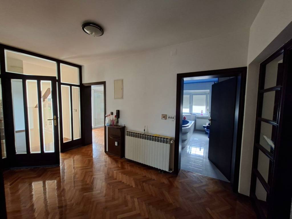 VISOKOPRIZEMNA VILA orginalno građena 1989.g., dim 15.20 x 11.10 m2, tlocrtne površine 215 m2 x 3 etaže (prizemlje, kat i potkrovlje) rekonstruirana je 1997 g. te dograđena dvorišna zgrada (prizemlje +kat) 2000 g. ukupne površine iznad 300 m2 (priz+ kat) u kojoj se nalaze bazen, fitness, sauna, 2 garaže, te u svakoj etaži odgovarajući sanitarni dio sa tuševima i toaletima; povezano sa glavnom građevinom, zajedno sa dvorištem (fontana, sjenica, roštilj,..) i teniskim igralištem nalaze se na parceli od 2702 m2. Kvalitetna gradnja: armiranobetonski nadvoji, ploče, grede i stubišta; nosivi zidovi šuplja opeka 25-30 cm, pregradni- opeka 6-10 cm, žbukano grubom i finom žbukom: hidroizolacija vanjskih zidova i ulazne terase, stubišta i terasa-granit, ograde-željezo i čelik,.. PRIZEMLJE VPR Ulaz u glavni objekt je moguć preko opločane, povišene terase rađene od granita kasmir, stražnjim ulazom i vezom/sobom na katu dvorišnog objekta. Glavni ulaz i balkoni na katu izvedeni u ovalu i u kompletnoj staklenoj stijeni pružaju poseban doživljaj spoja unutarnjeg i vanjskog prostora. U PRIZEMLJU KUĆE nalazi se centralni dio- dnevni boravak i blagavaona povezani u jedinstvenu cjelinu povr cca 50 m2 oplemeljeni poluetažama i stupovima; soba, kuhinja, kupaonica i toalet zasebno te ulazni hol sa stubištem u kamenom granitu i ogradi čeličnih stupova sa drvenim rukohvatima do gornjeg kat i potkrovlja. KAT sadrži 4 sobe: 2 sobe sa staklenom stijenom i izlazom na ovalnu terasu, vrlo komfornu spavaću sobu sa ugrađenom garderobom i ormarima, kupaonicu sa jakuzzi-em te još jednu sobu koja ujedno povezuje kuću sa dvorišnom zgradom. Centralno grijanje provedeno u sve dijelove stambenog i rekreacijskog dijela, sve vrlo uredno održavano i servisirano. Podovi u prostorijama sukladno namjeni: kvalitetni hrastov parket I klase, 2 cm u sobama te keramika. Zidovi gletani i ličeni. Tavan do kojeg vodi uređeno stubište (stupovi čeličnog profila, drveni rukohvat) prostire se iznad cijelog prostora gornjeg kata- uredan i pogodan za uređenje još jedne etaže. Krov- dvostrešan i u dijelu ovalan, potpuna izolacija; pokrov- bitumenska šindra tegola, oluci, okapnice i svi opšavi kao i dimnjaka-bakreni lim DVORIŠNA ZGRADA ukupne površine preko 300 m2 sadrži :PRIZEMLJE-ukupne površine 157 m2 i uključuje: ulazni predprostor, spremište ogrijeva, kotlovnicu, 2 garaže, spremište, garderobu, sanitarni čvor i zatvoreni bazen veličine 6 x 8 m. Prostor za rekreaciju u potpunosti je opskrbljen svim sadržajima, staklena stijena oko cijelog bazena sa pogledom na zelenilo, ukrasno drveće i staze parka, klupice za odmor unutar i izvan objekta, sve popločano; sanitarni dio sa tuševima i toaletima (muški i ženski) i stubištem za KAT povr 102 m2, koji sadrži: fitnes, saunu, sanitarni čvor, spremište, balkon, loggia, stubište, te komfornu, svijetlu prostor/sobu za boravak gostiju i prigodna okupljanja povr cca 50 m2 koja povezuje dvorišni objekt sa glavnom kućom. Stolarija nova- kvalitetna PVC, kvalitetni hrastov parket I klase, 2 cm u sobama, KLIME, ograde na balkonima i loggiama- čelične cijevi i horizontalne prečke željezo, podovi- keramika. Unutrašnjost svih zidova i podova dovršena, kvalitetan hrastov parket, stubište kameni granit, zaštićeno sa drvenim rukohvatom. Kotlovnica sadrži sustav peći za sve vrste i mogućnosti grijanja kao i mogućnosti kombinacije istih: peć i rezervoar za lož ulje, peć i spremnik za pelet te peć na kruta goriva, sve u funkciji, redovito održavano i servisirano. Centralno grijanje cijevima i radijatorima u svim etažama.. Dvorište i okućnica je u potpunosti kultivizirana, opločena betonskim kockama u prilaznom dijelu svih objekata, mogućnost više parkinga te uređena travnatim dijelom i opločanim stazama koje vode do teniskog igrališta, drvene sjenice sa klupicama i roštiljem uz nju, te ukrasnim, egzotičnim drvećem za potpuni doživljaj užitka i relaksacije. Prednji dio također uređen kao travnata površinom sa različitim cvijećem te velikom fontanu od granit-kasmira u sredini Svi priključci: struja, voda, kanalizacija Asfaltnom prometnicom povezana sa ostalim dijelovima grada; osigurava posebno mirno življenje, a lokacija jamči dobru povezanost. ZBOG VELIČINE I UREĐENOSTI, KVALITETNE GRADNJE, SADRŽAJNOSTI OBJEKTA, MIRNE LOKACIJE, UREĐENE OKUĆNICE SA MOGUĆNOŠĆU VIŠE PARKINGA, SPORTSKIH SADRŽAJA- KUĆA PRUŽA RIJETKU I IDEALNU MOGUĆNOST KOMBINACIJE ODMORA, REKREACIJE, RELAKSACIJE I SADRŽAJNO BOGATO OBITELJSKOG ŽIVOTA KAO I RAZLIČITIH KOMBINACIJA STAMBENO-POSLOVNOG PROSTORA ILI IZVANREDNU MOGUĆNOST ZA RAZLIČITE INVESTICIJE