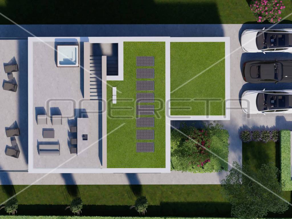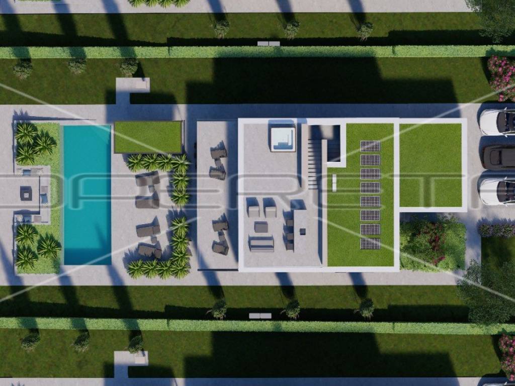 The gross square footage of each house is 270 m2, while the net area of the interior residential part is 204 m2. In addition, each villa has an additional area of 310 m2, which includes sunbathing areas, canopies, balconies, paths, a fire pit, a rooftop terrace, and an external staircase. Each villa has three parking spaces of 40 m2, and the pools have 36 m2 of water surface, except for Villa One, whose pool is 30 m2.
