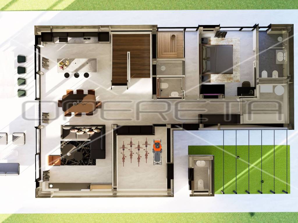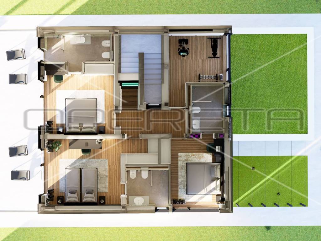 The ground floor of each villa consists of an entrance hall, a staircase to access the first floor and the rooftop terrace, a living room, a kitchen and dining room, a bedroom with a separate bathroom, an additional toilet, a bathroom and a sauna, a utility room with a laundry room, and a storeroom and external toilet, each with a separate entrance. The first floor has three bedrooms with individual bathrooms, a hallway, and an additional room that can serve as a gym, playroom, or similar. Also, on the floor is a staircase for access to the roof terrace equipped with an external bar, sunbathing area, and a hydro-massage tub.