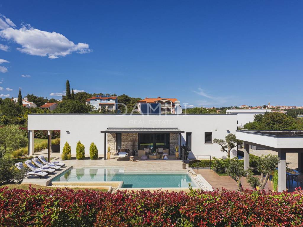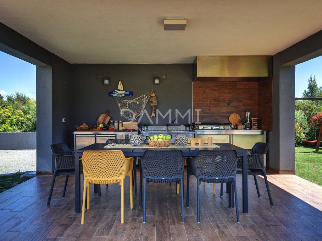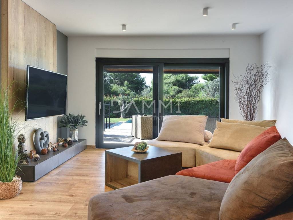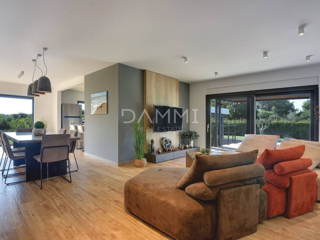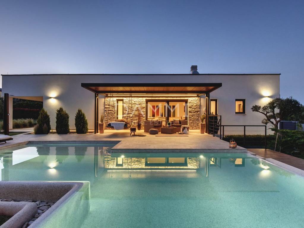 This luxurious ground floor villa was built in 2017 and was designed according to the principles of ancient Indian Vastu architecture, which ensures harmony with nature and a pleasant flow of energy throughout the space. The villa extends over a total of 1760 m2 of fenced land, surrounded by untouched Mediterranean nature, large olive trees and greenery - providing complete privacy, peace and relaxation.