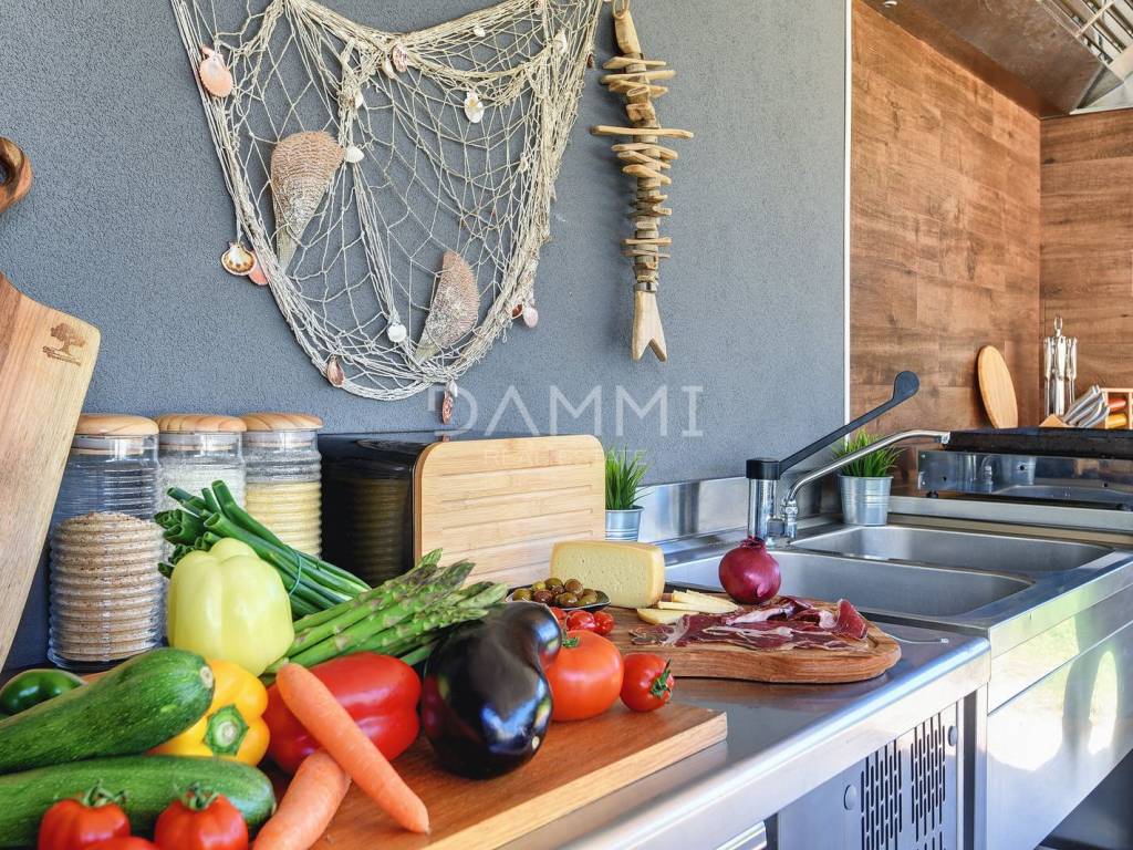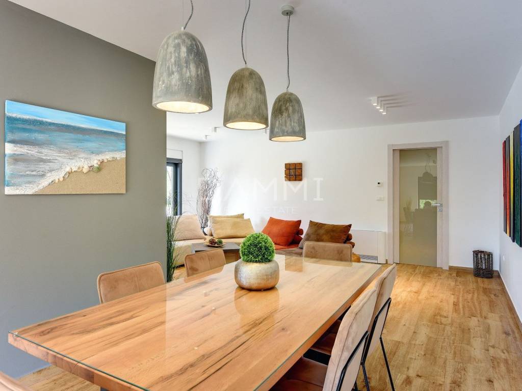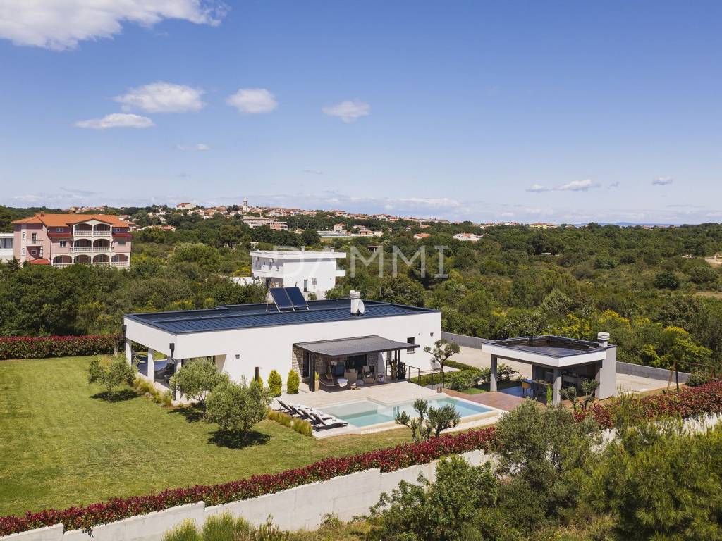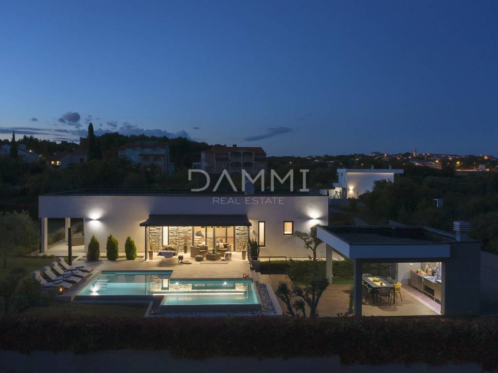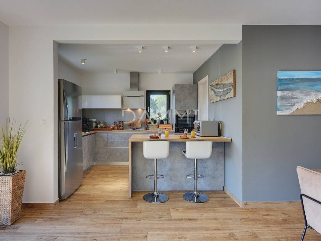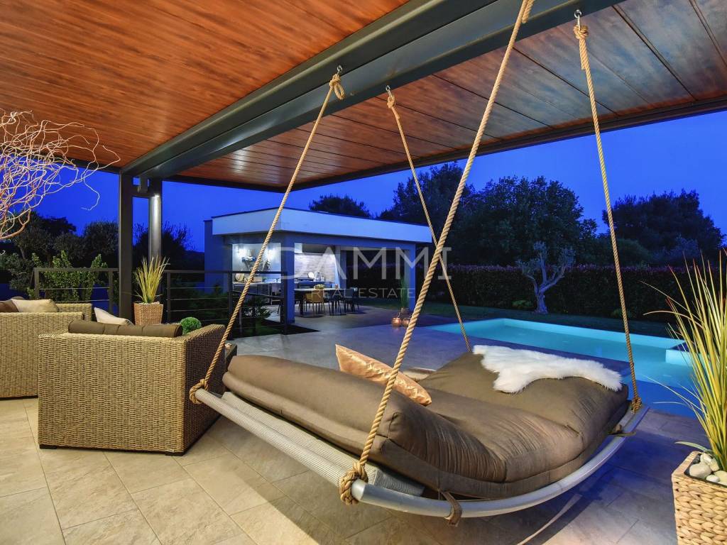 This luxurious ground floor villa was built in 2017 and was designed according to the principles of ancient Indian Vastu architecture, which ensures harmony with nature and a pleasant flow of energy throughout the space. The villa extends over a total of 1760 m2 of fenced land, surrounded by untouched Mediterranean nature, large olive trees and greenery - providing complete privacy, peace and relaxation.