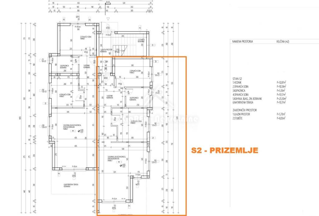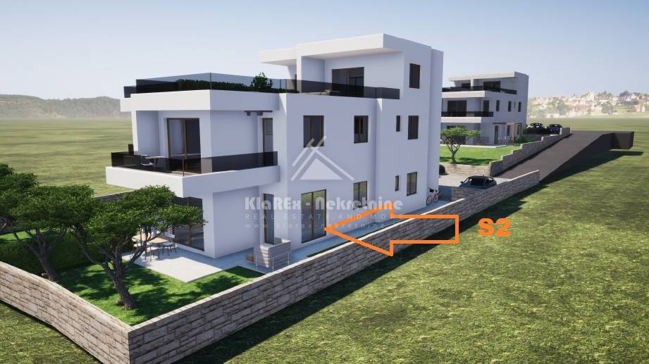 Residential unit S2 - two-room apartment on the ground floor of a building with southeast orientation. The apartment has a net area of ​​87.05 m2, and consists of: hallway, bathroom, two bedrooms, kitchen with dining room, living room with access to a covered terrace of 15.17 m2 which has access to a spacious yard of 108 m2. The apartment has one parking space.