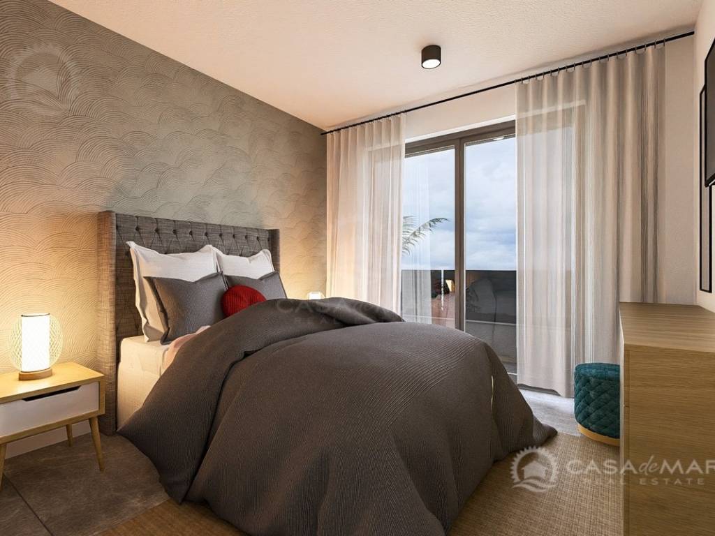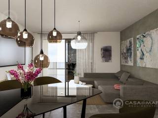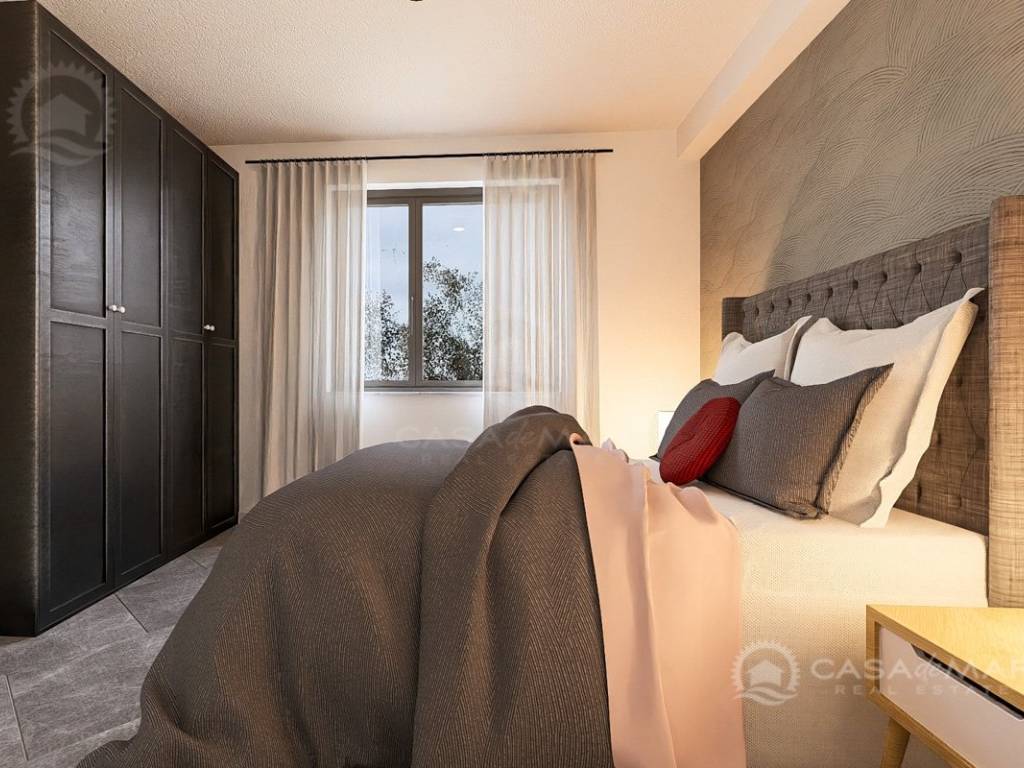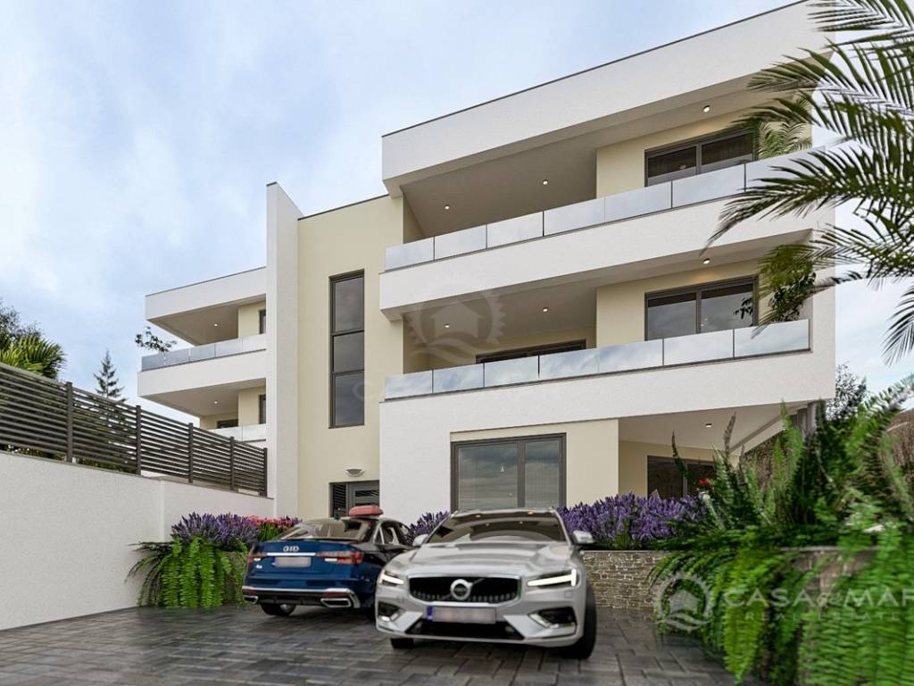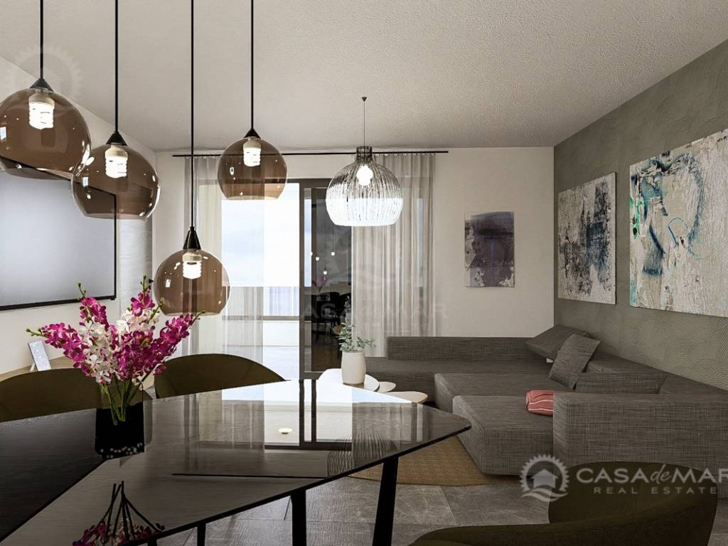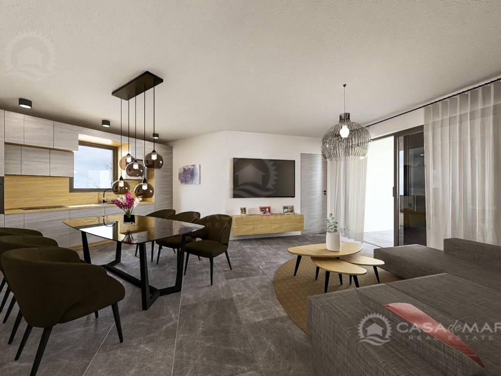 The apartment offers 101 m² of living space with a functional layout: a spacious open space living room with kitchen and dining area, three comfortable bedrooms, two bathrooms, a guest toilet, and a storage room. From the living area, there is access to a covered terrace with a stunning panoramic sea view – the perfect place to relax and enjoy the surroundings.