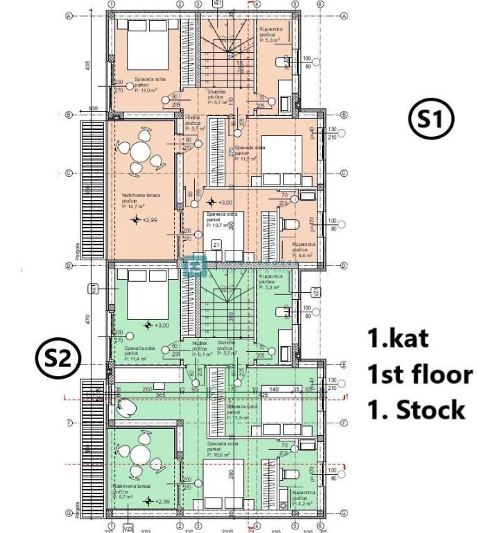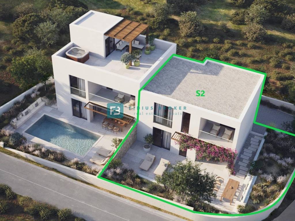 House S1 with a net usable area of ​​186.78 m2 consists of three floors: ground floor + 1st floor + roof terrace. The ground floor has a covered entrance, entrance hall, storage room, toilet, kitchen with dining room and access to a covered terrace, garden, sundeck and swimming pool of 26.25 m2. An internal staircase leads to the 1st floor, which consists of a hallway, three bedrooms, two bathrooms and a covered terrace with a sea view. The staircase leads to a spacious roof terrace with a panoramic view of the sea and the city. The room on this floor consists of a summer kitchen, staircase and toilet. The house has two parking spaces. The price is: €550,000.