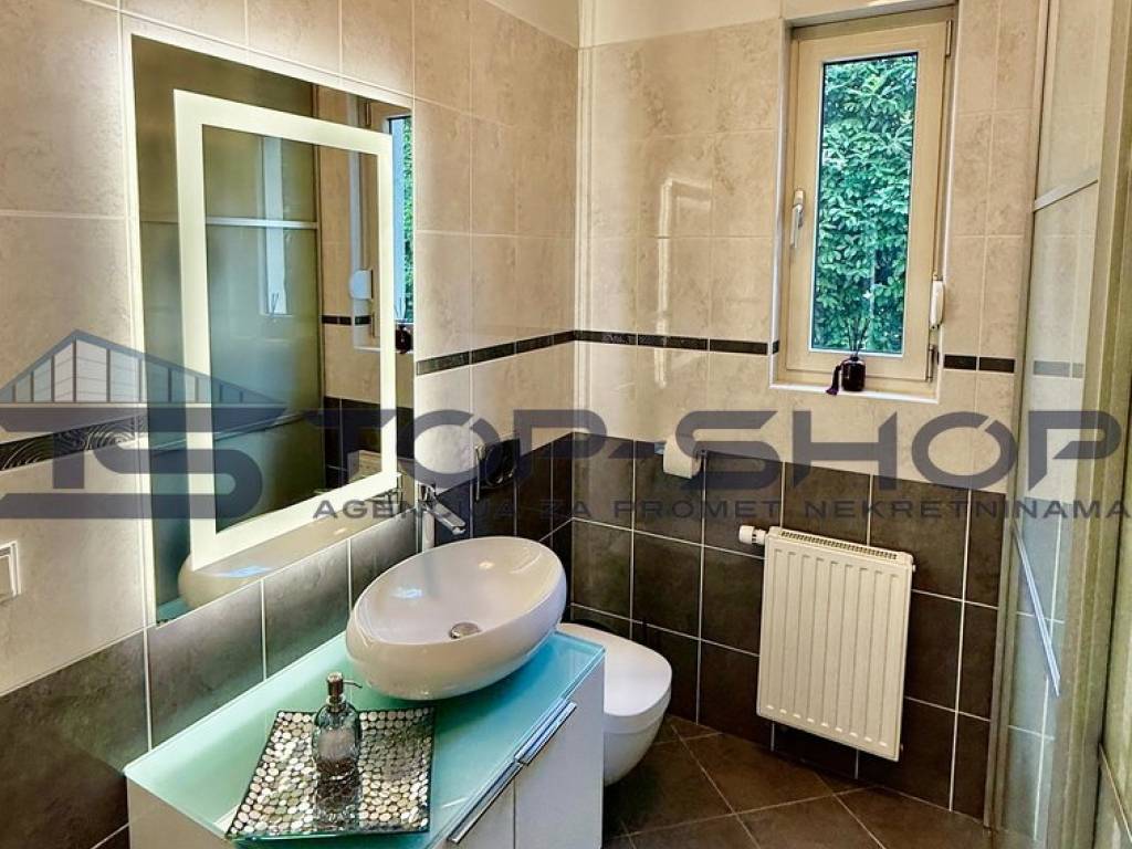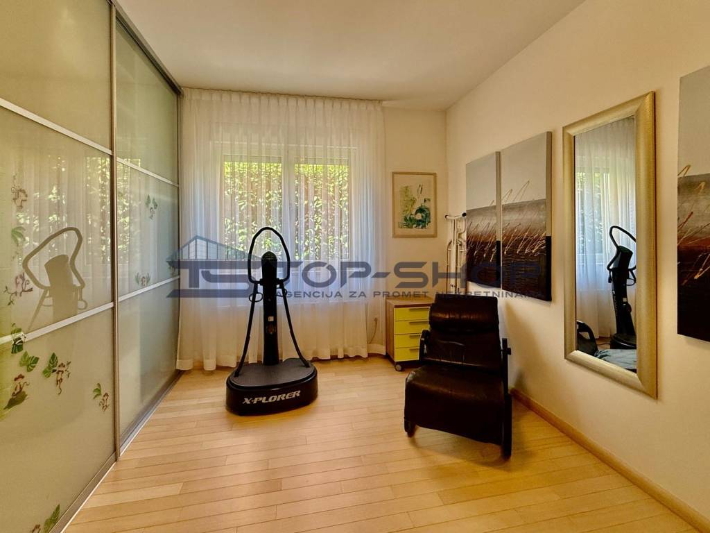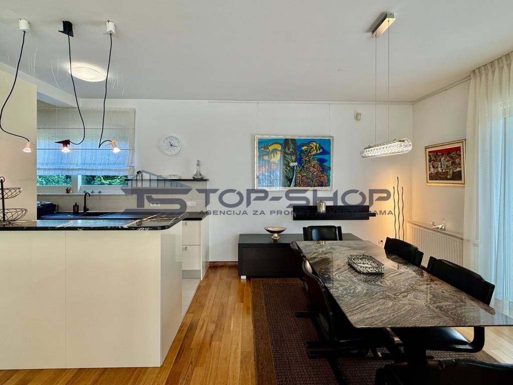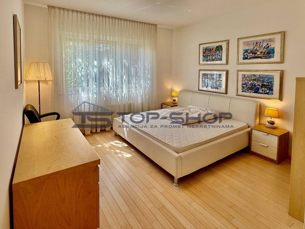 U opremi se ističu kuhinja s aparatima, perilica posuđa, perilica rublja, kada, TV, radni stol i krevet. Grijanje je na plin, a za dodatnu udobnost tu je i klima uređaj. Stan je opremljen optičkim priključkom, što omogućuje brz i pouzdan pristup internetu. Dodatnu sigurnost pruža video nadzor, a zgrada ima i dizalo, što olakšava svakodnevicu. Na raspolaganju su garaža i parkiralište.sastoji se od prostranog dnevnog boravka povezanog sa blagovaonicom i izlazom na terasu, kuhinje, tri spavaće sobe, dvije kupaonice i toaleta.Uz stan je i korištenje vrta sa sjenicom.