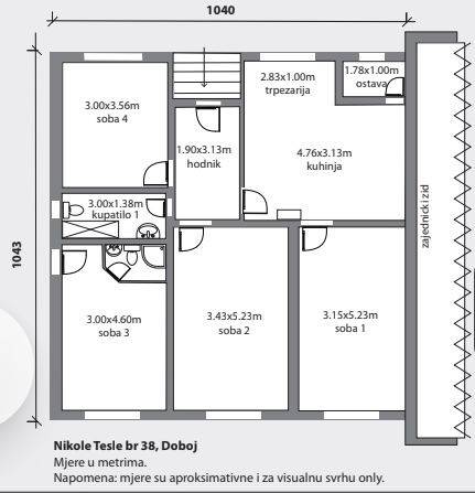 Prodaje se kuća prizemnica od 122 m2  sa dvorištem od 360 m2, u Doboju u ulici Nikole Tesle. Izgrađena je 1930. god. i treba se kompletno adaptirati. Unutar kuće kompletno je uređen apartman od 17 m2 sa vlastitom kupaonicom i odvojenim ulazom , koji se može odmah koristiti za stanovanje dok se ostatak kuće uređuje.