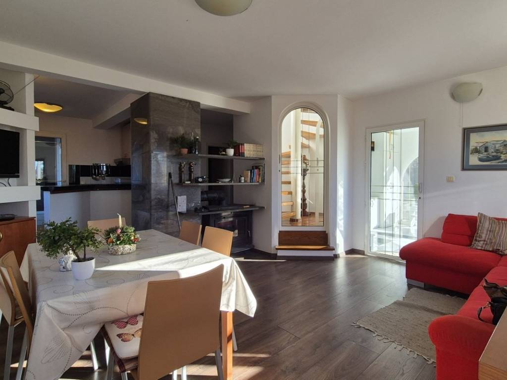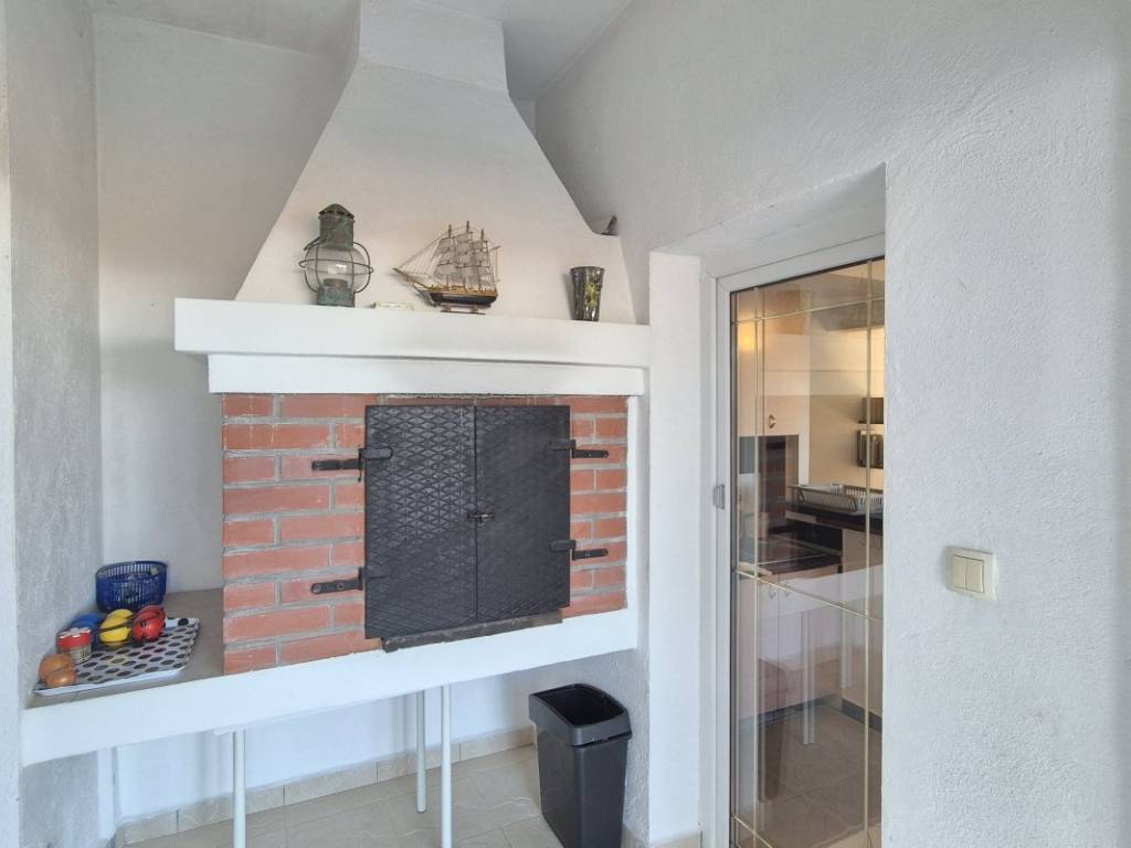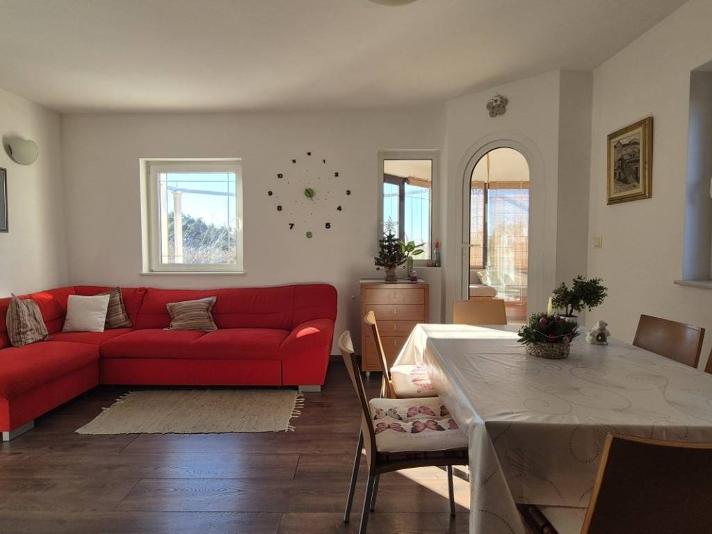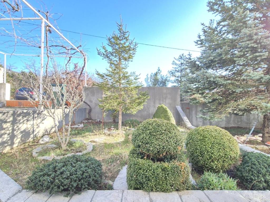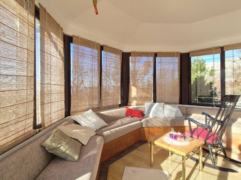 The house is situated on a plot of 850 m with the possibility of building a swimming pool. The ground floor includes a kitchen, dining area, and living room, one bedroom, a bathroom, two winter gardens, and a storage room with direct access to the garage. The upper floor features three bedrooms, a bathroom, and an additional room arranged as a living area with a small kitchen and access to the terrace. The house has an indoor fireplace, and the outbuilding, used as a cellar, also contains a fireplace. In addition to the garage, there are two outdoor parking spaces. The location is suitable for rafting, cycling, and hiking, while the nearest beaches are approximately 15 minutes away by car.