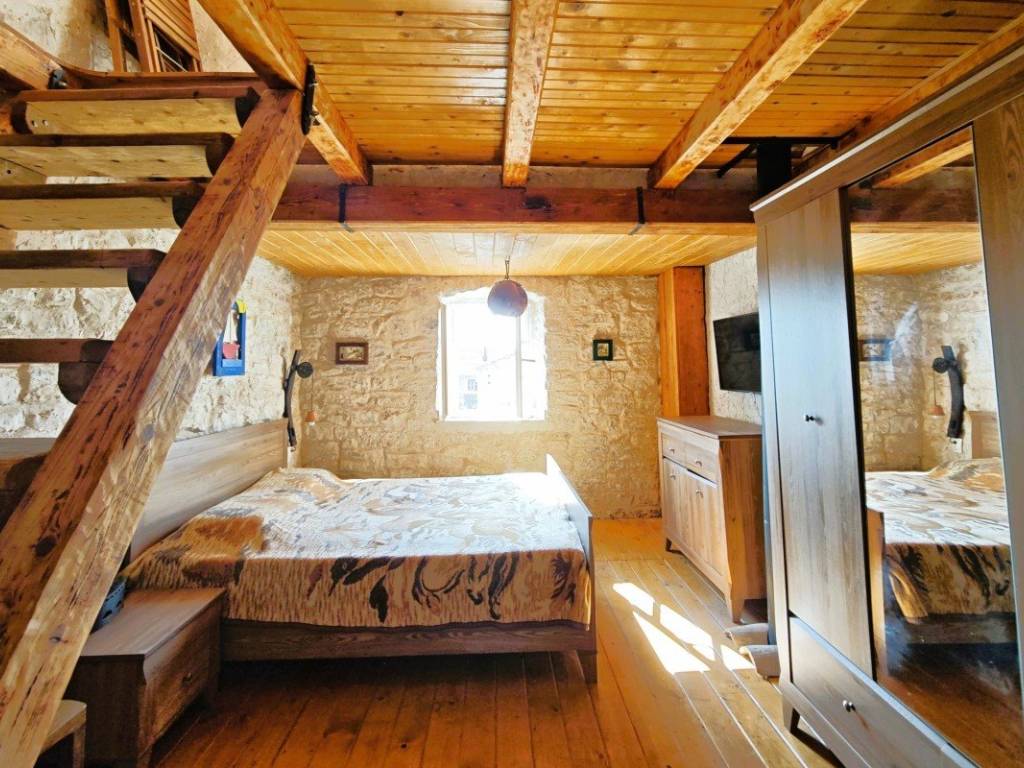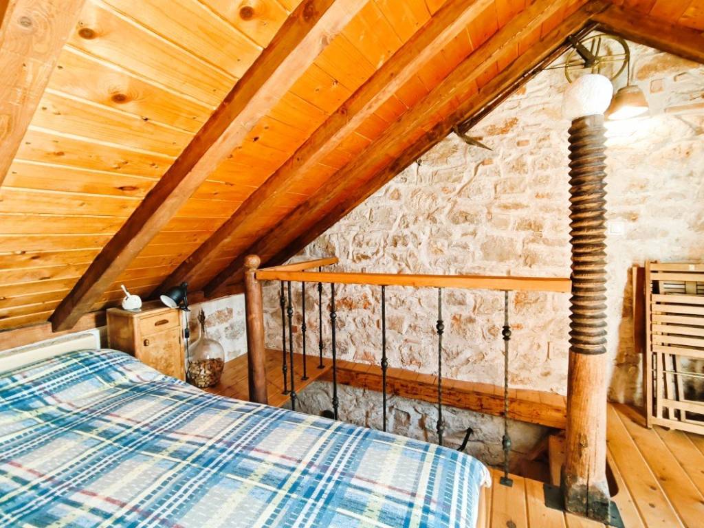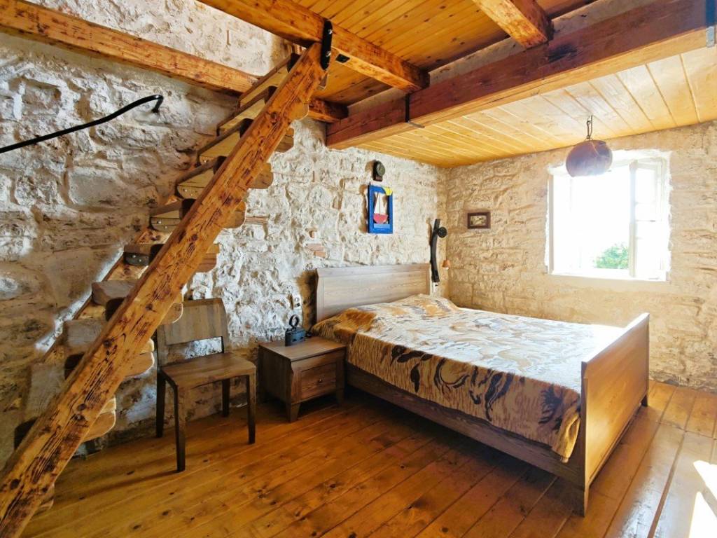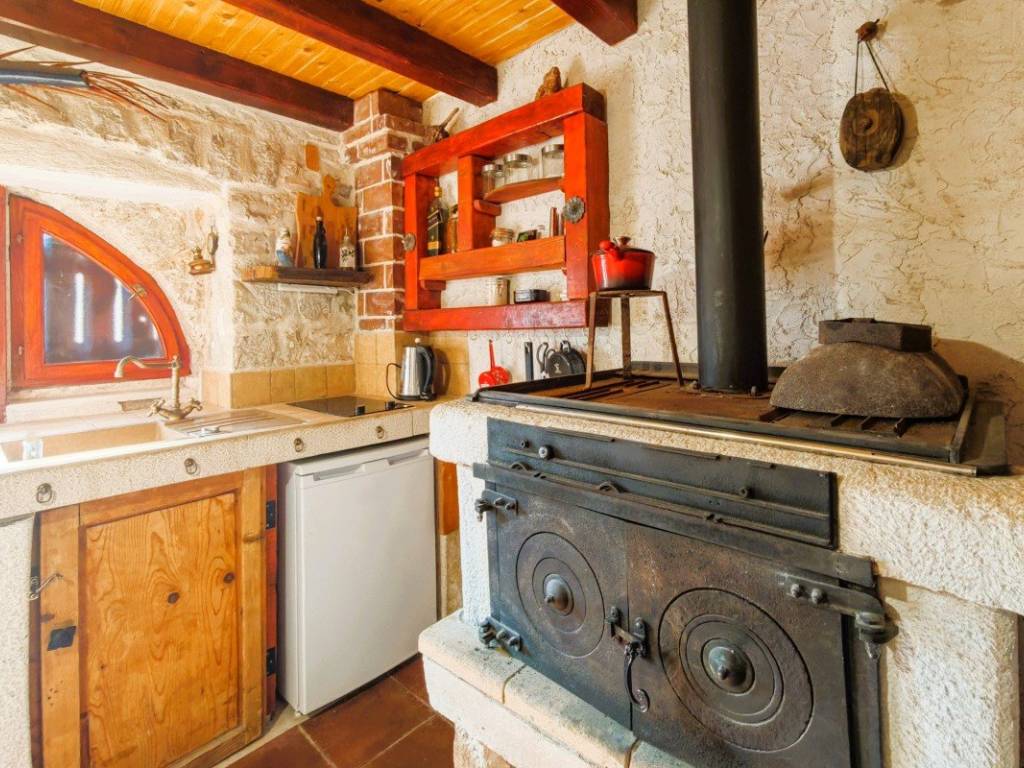 On the ground floor there is a living area with a kitchen and dining room where a fireplace with the possibility of grilling and preparing peka provides a special atmosphere, and a bathroom. On the first floor there is a spacious bedroom with rustic solid wood furniture, and in the attic there is an additional bedroom with access to a terrace with a beautiful view of the town, nature and the sea. There is also an outdoor shower on the terrace.