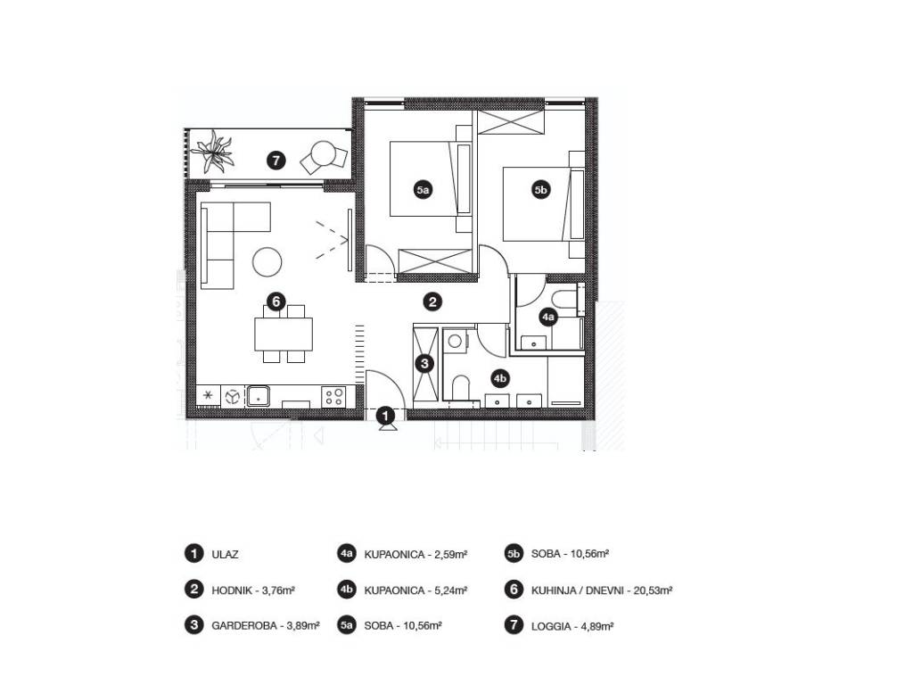 On the first floor of building B is located apartment S4 (total net area 62 m2) whose layout includes a hallway with a wardrobe, a living room connected to the kitchen and dining room and an exit to the loggia. This is followed by a hallway leading to two bedrooms and two bathrooms.