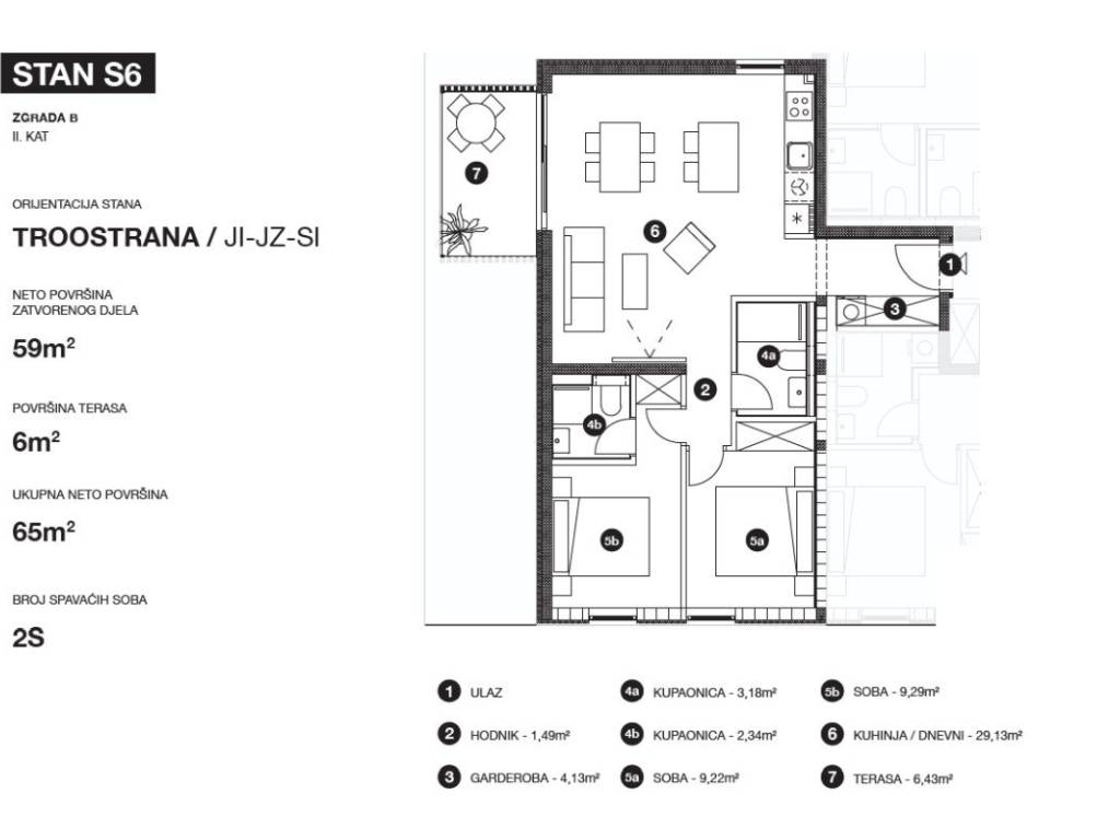On the second floor of building B, there is apartment S6 with a total net area of 65 m2. It consists of an entrance hall with a wardrobe, an open concept spacious living area with dining room and kitchen, from which there is an exit to the terrace. This is followed by a hallway with a bathroom and a hallway leading to two bedrooms, one of which has its own bathroom.