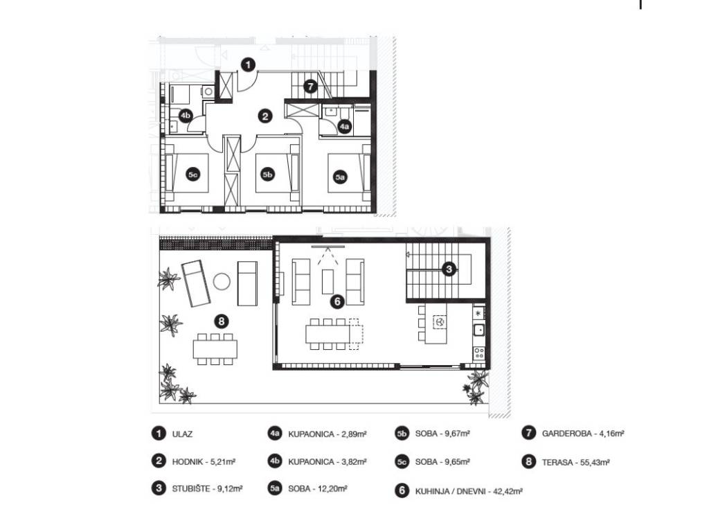 On the second floor of building B is apartment S8, with a total net area of 155 m2. The lower floor includes a hallway with a wardrobe, two bedrooms, a bathroom and a master bedroom (ensuite bathroom). An internal staircase leads to the upper floor with an open living room, dining room and kitchen, from which there is access to a spacious terrace of 55 m2. The apartment has a two-sided orientation NE- SE, which provides it with plenty of natural light throughout the day.