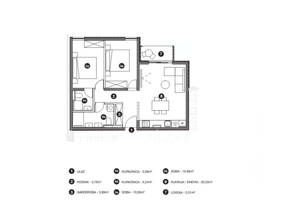 On the first floor of building A, apartment S4 is located, the layout of which includes a hallway with a wardrobe, an open-concept living room connected to the kitchen and dining room and an exit to the loggia. This is followed by a hallway leading to two bedrooms and two bathrooms.
