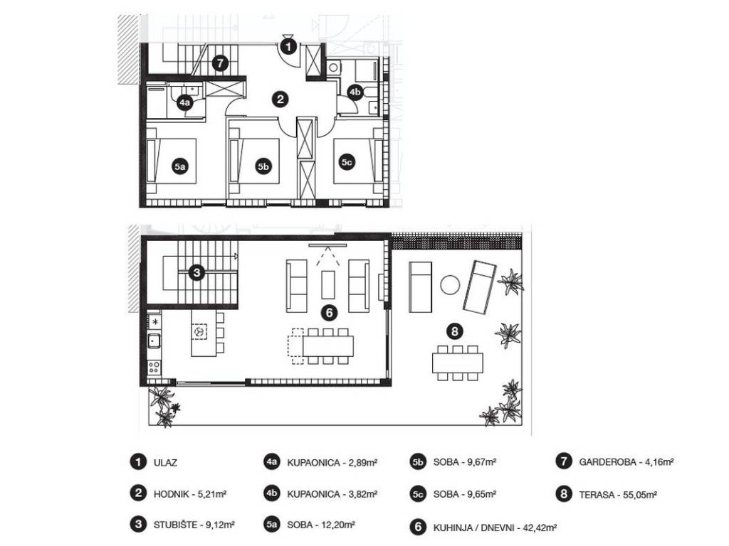 Located on the second floor of Building A, this attractive duplex apartment (S8) consists of an entrance hall with a wardrobe, three bedrooms, two bathrooms, and an internal staircase leading to the upper level.