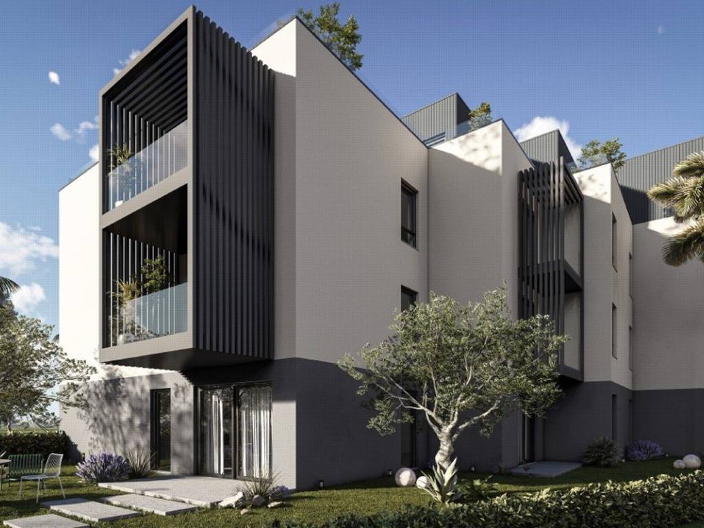The building combines contemporary design with a Mediterranean atmosphere, featuring spacious terraces and carefully landscaped surroundings.